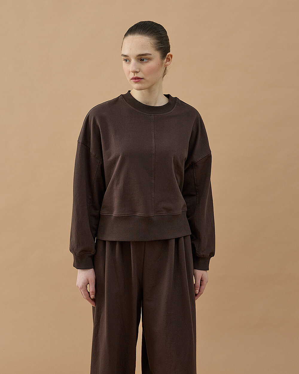 Oversize kalıplı sweatshirt ve dökümlü geniş paça pantolon kombininden oluşan bu takım, modern ve salaş görünümüyle öne çıkar. Minimal dikiş detayları ve doğal duruşu sayesinde hem evde hem dışarıda rahatlıkla kullanılabilir.