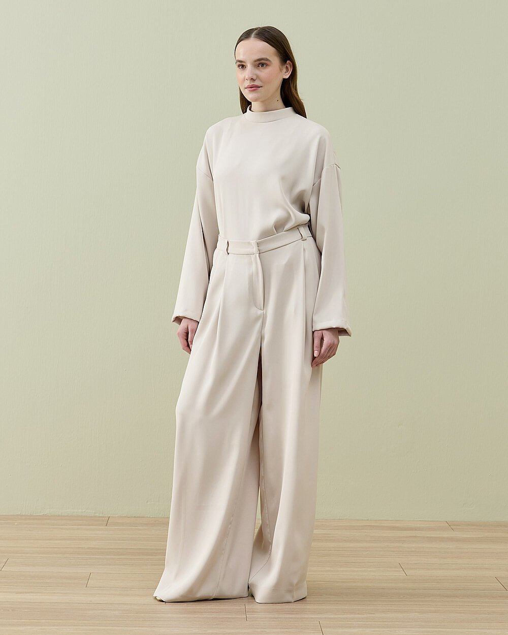 Oversize kalıba sahip basic bluz, sade ve modern duruşuyla kombin özgürlüğü sağlarken; yüksek bel, geniş paça palazzo pantolon vücut formunu dengeleyerek zarif bir siluet oluşturur.