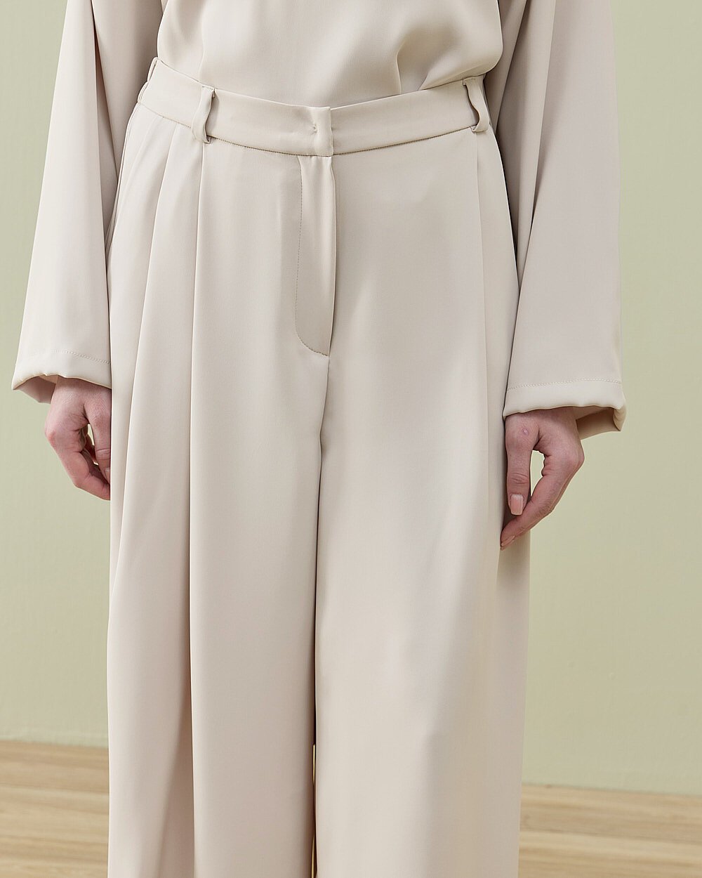 Krep basic bluz ve krep çift pileli palazzo pantolon birlikte sunulmaktadır.