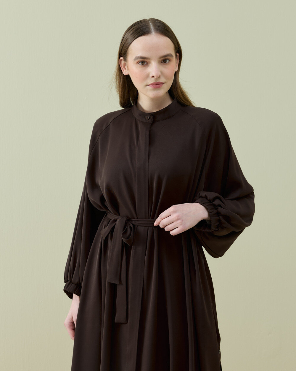 Detay: Hakim yakalı ve önden komple düğmelidir. İki yandan düğmeli ve belden kuşaklıdır. Manşeti lastikli ve büzgülüdür. Astarsızdır.