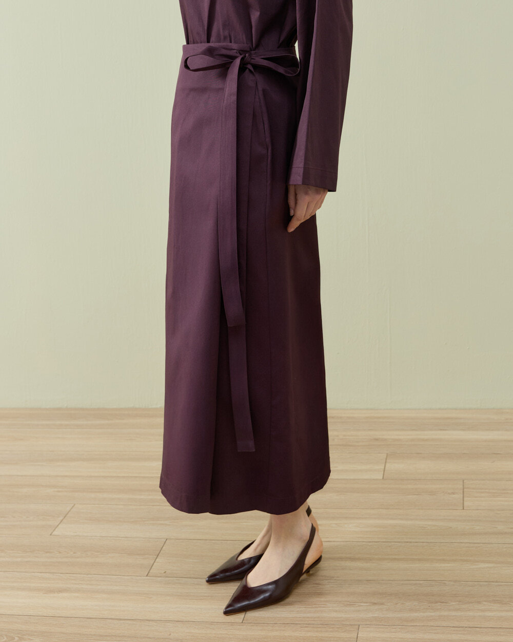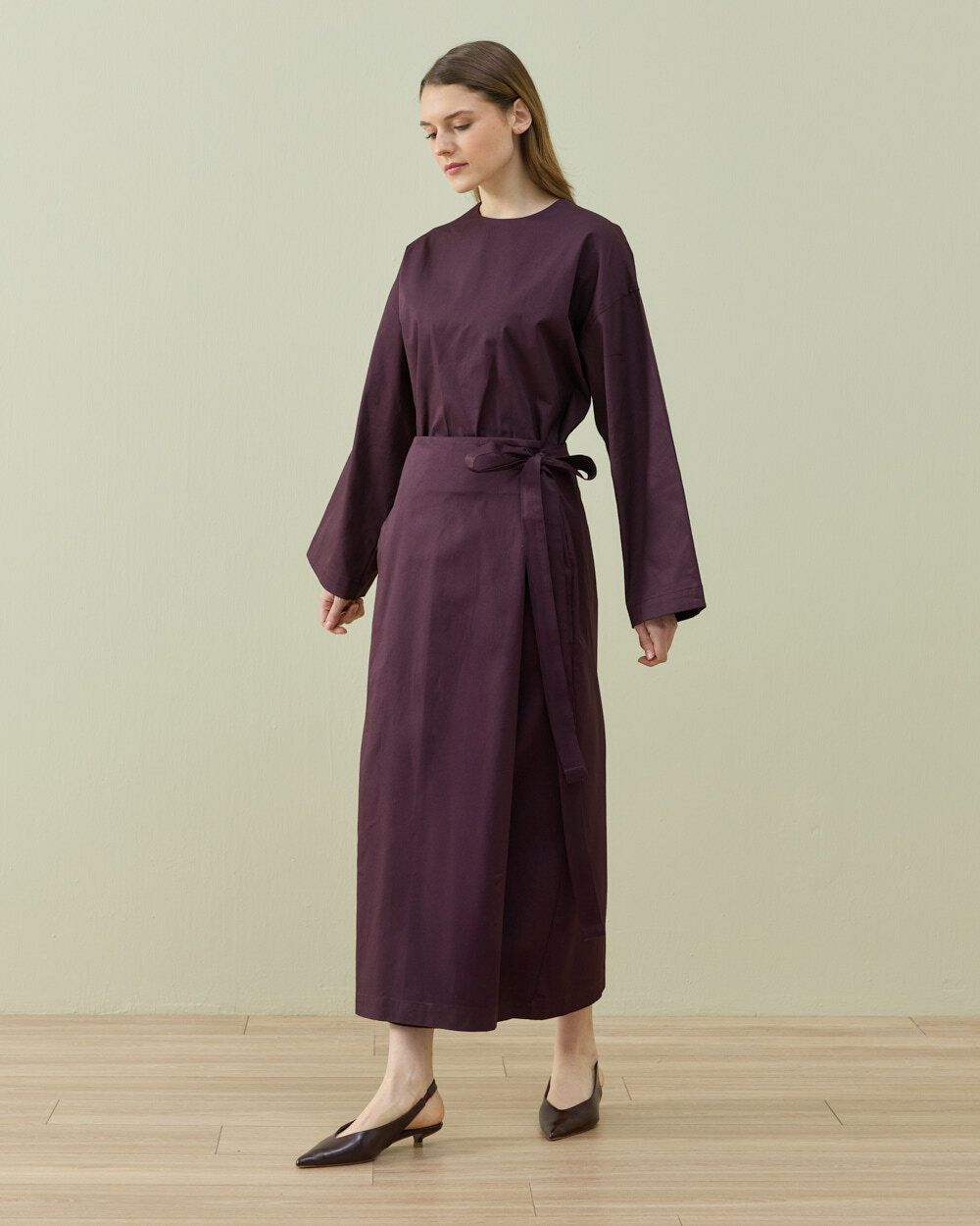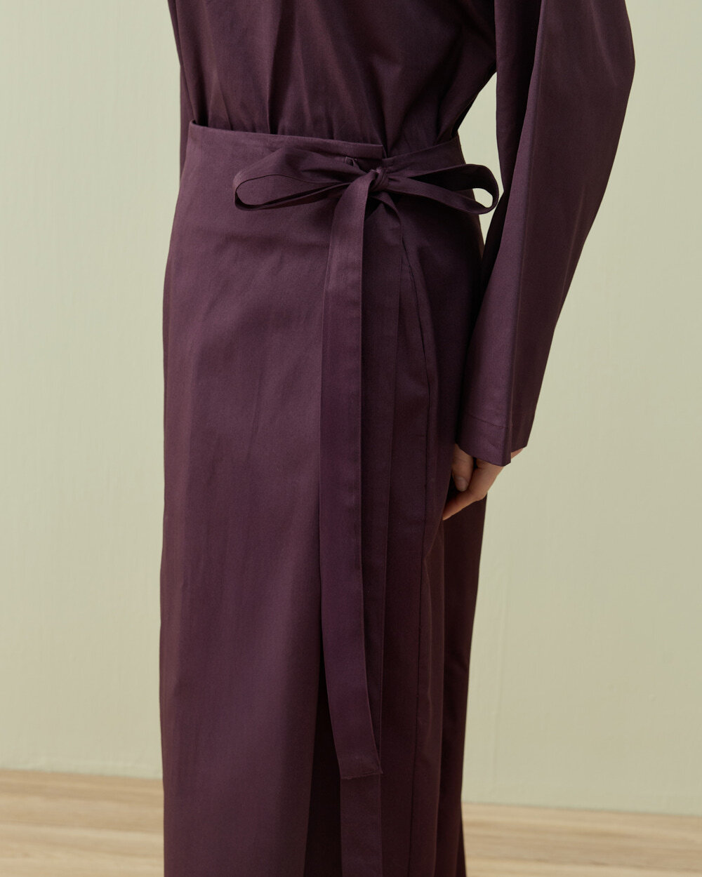 Modern sarmal formdan ilham alan bu etek, yandan bağlamalı kapama detayı ile fonksiyonel ve ayarlanabilir bir kullanım sunar. Ön panelde yer alan kapaklı yapı, eteğe katmanlı bir görünüm kazandırırken aynı zamanda kontrollü bir hareket alanı sağlar. Bel hattındaki bağlama detayı sayesinde vücuda göre kişisel ayar yapılabilir ve bel formu net şekilde tanımlanır. Düz ve temiz hatlı silueti, minimal bir duruş sunarken uzun boy tasarımı ile dengeli bir oran oluşturur. Orta ağırlıktaki gabardin dokuma kumaş yapısı, formunu koruyan tok bir duruş sağlarken gün boyu konforlu kullanım imkânı sunar. Yan kapama sistemi sayesinde hem fonksiyonel hem de tasarımsal bir farklılık yaratan, çok yönlü bir alt giyim parçasıdır.