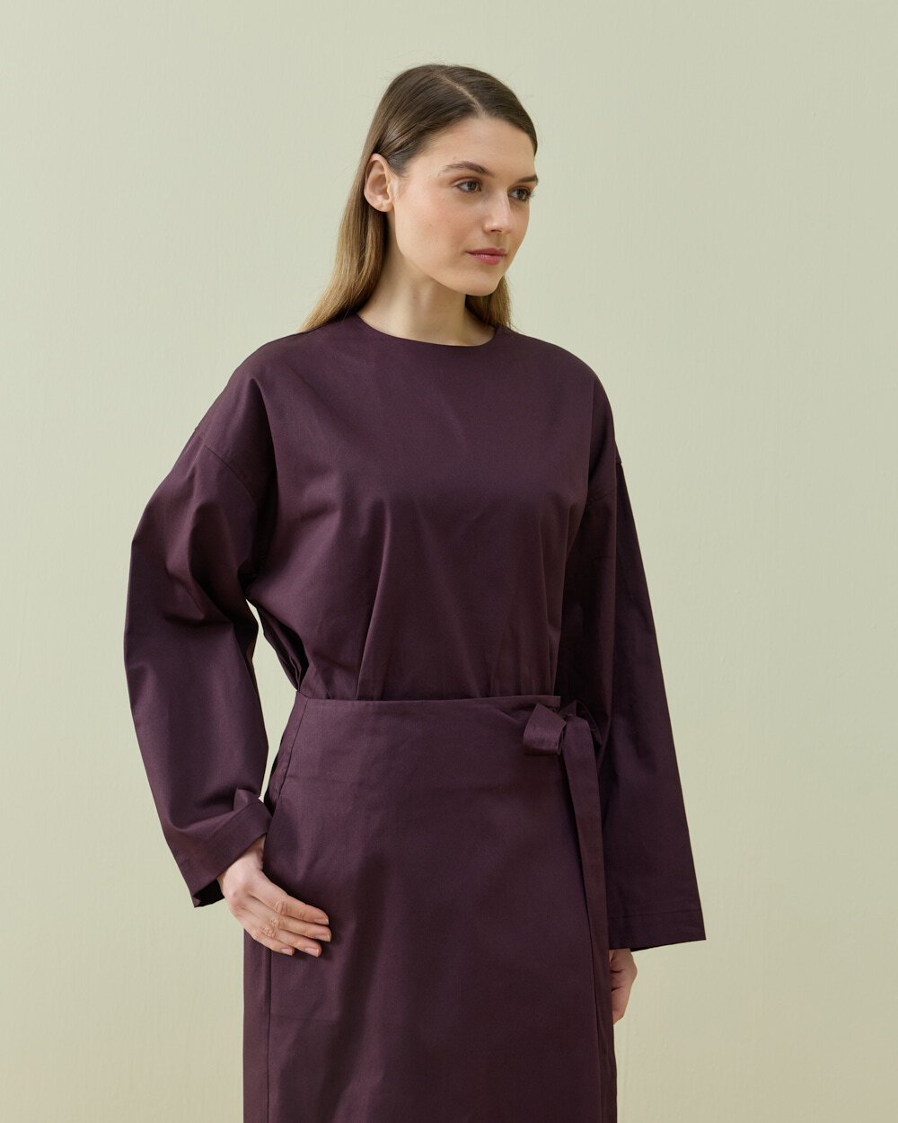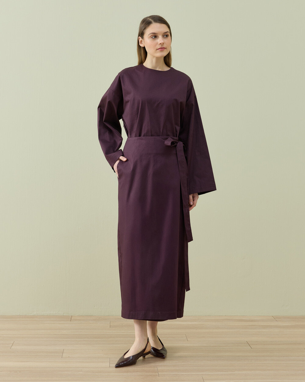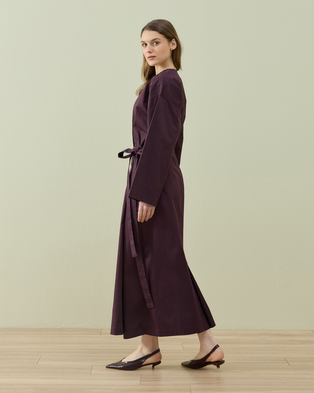 Modern sarmal formdan ilham alan bu etek, yandan bağlamalı kapama detayı ile fonksiyonel ve ayarlanabilir bir kullanım sunar. Ön panelde yer alan kapaklı yapı, eteğe katmanlı bir görünüm kazandırırken aynı zamanda kontrollü bir hareket alanı sağlar. Bel hattındaki bağlama detayı sayesinde vücuda göre kişisel ayar yapılabilir ve bel formu net şekilde tanımlanır. Düz ve temiz hatlı silueti, minimal bir duruş sunarken uzun boy tasarımı ile dengeli bir oran oluşturur. Orta ağırlıktaki gabardin dokuma kumaş yapısı, formunu koruyan tok bir duruş sağlarken gün boyu konforlu kullanım imkânı sunar. Yan kapama sistemi sayesinde hem fonksiyonel hem de tasarımsal bir farklılık yaratan, çok yönlü bir alt giyim parçasıdır.