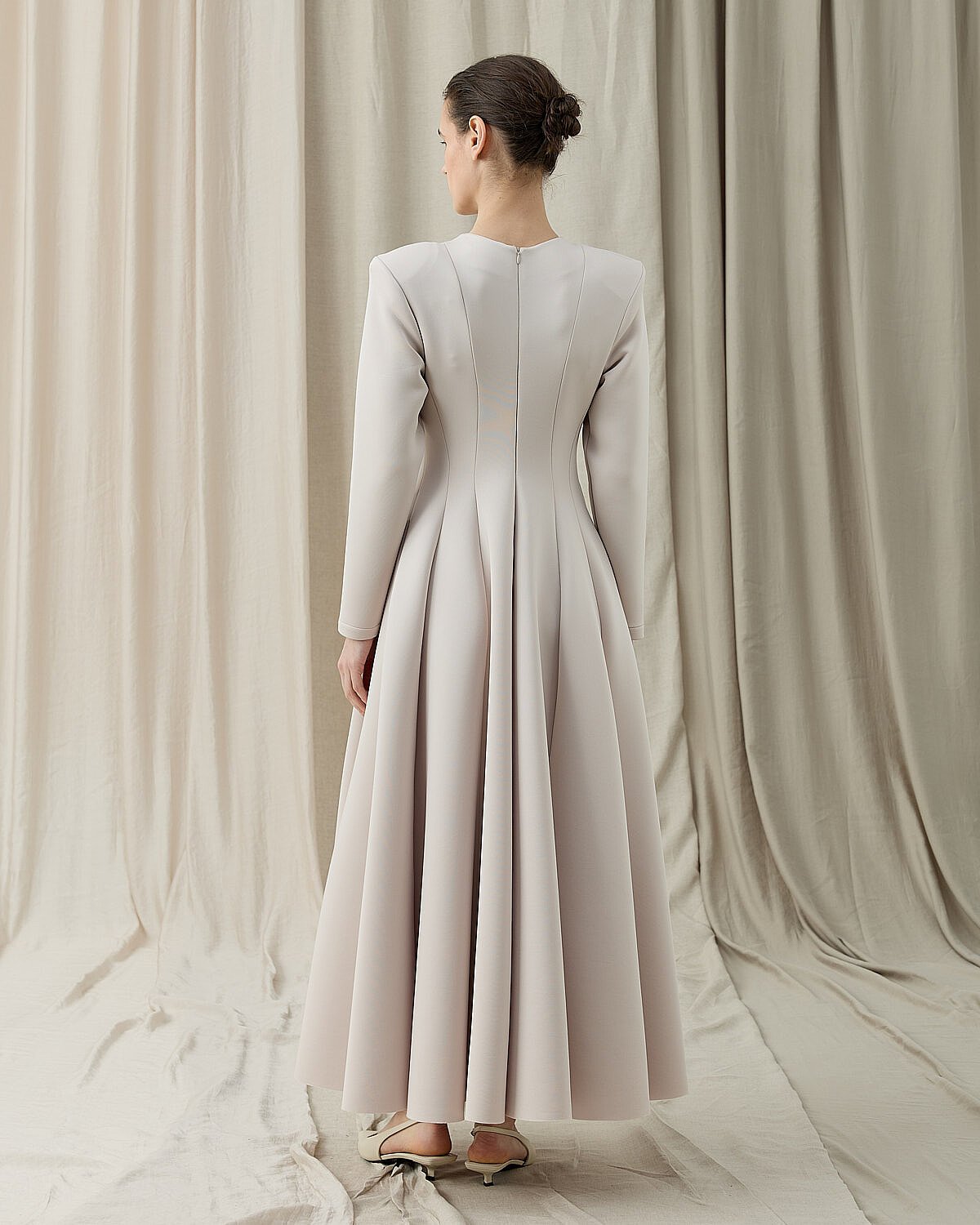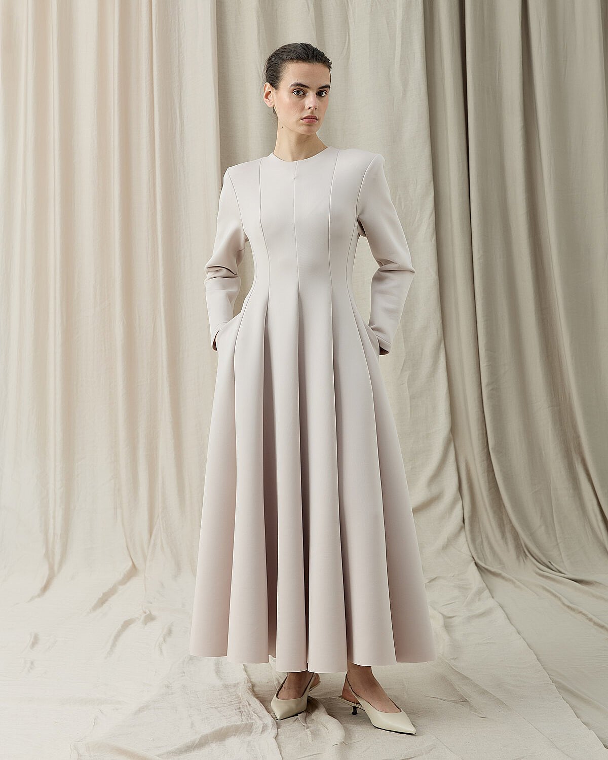 Oturan kalıptır.Zarif formu ve vücuda oturan kesimiyle öne çıkan Puf Parçalı Oturan Fit Elbise, siyahın zamansız şıklığını modern bir siluetle buluşturur. Üst bedende formu toparlayan yapısı, belden aşağı doğru akıcı ve pileli etek kesimiyle dengeli bir duruş sunar. Uzun kollu tasarımı, mevsim geçişlerinde ve serin günlerde konforlu bir kullanım sağlar. Yan cepleri, elbiseye hem fonksiyonellik hem de günlük şıklık katar. Minimal ve güçlü duruşuyla özel davetlerden günlük şık kombinlere kadar geniş bir kullanım alanı sunar. Topuklu ayakkabılarla klasik, düz ayakkabılarla ise modern bir stil elde edilebilir.