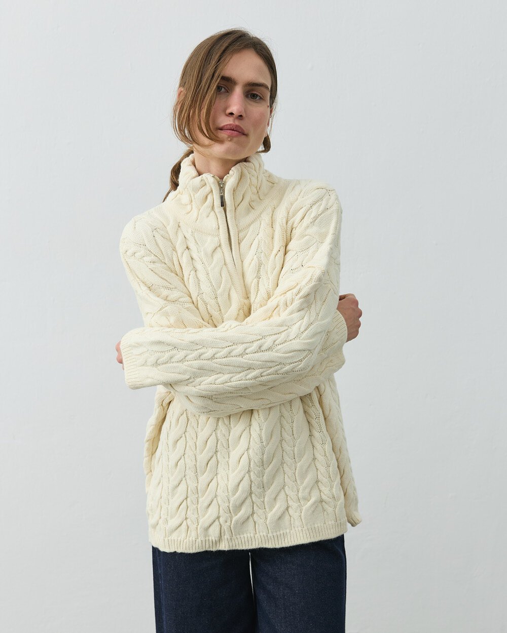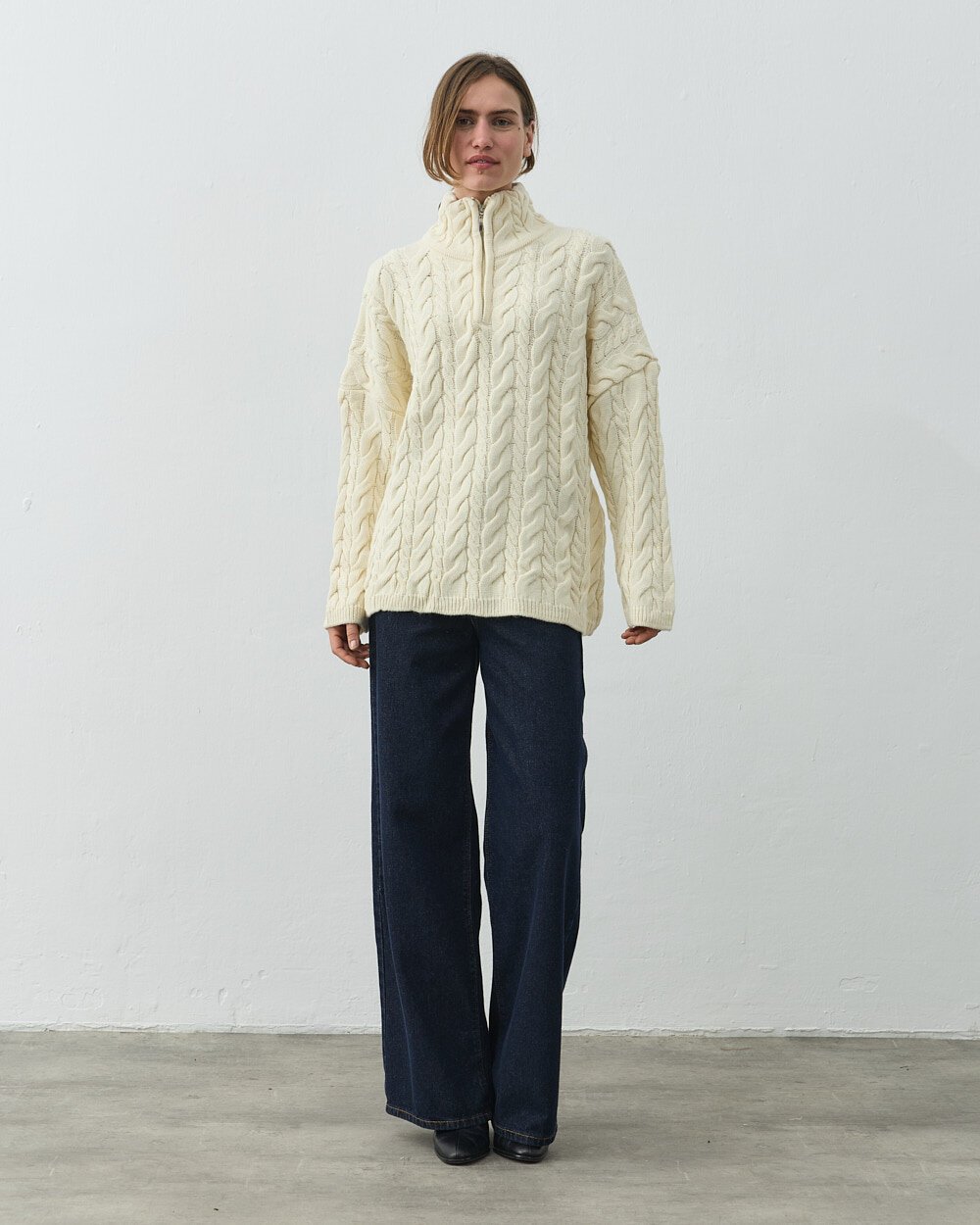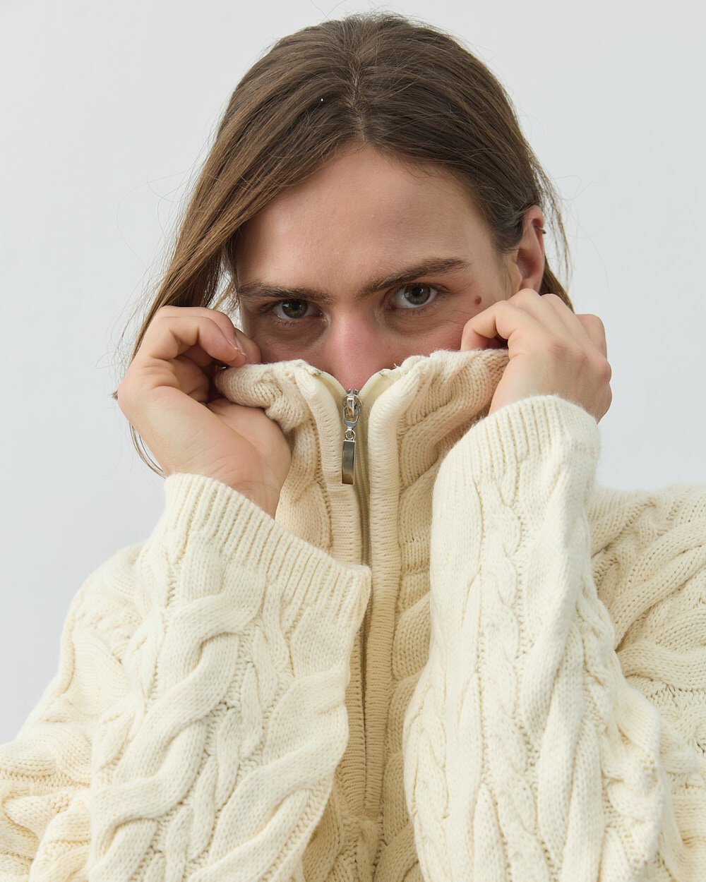 Saçörgü Yakası Fermuarlı Kazak Krem
