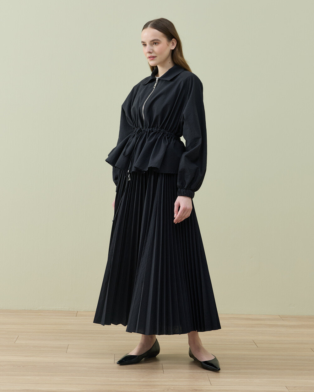 Modern ve feminen detaylarıyla öne çıkan bu ceket, bel kısmındaki büzgü detayı sayesinde vücuda form kazandıran şık bir siluet oluşturur. Fermuarlı ön tasarımı pratik kullanım sağlarken, alt kısmındaki volanlı form hareketli ve zarif bir görünüm sunar. Günlük kombinlerde olduğu kadar şık kombinlerde de rahatlıkla kullanılabilecek zamansız bir parçadır.