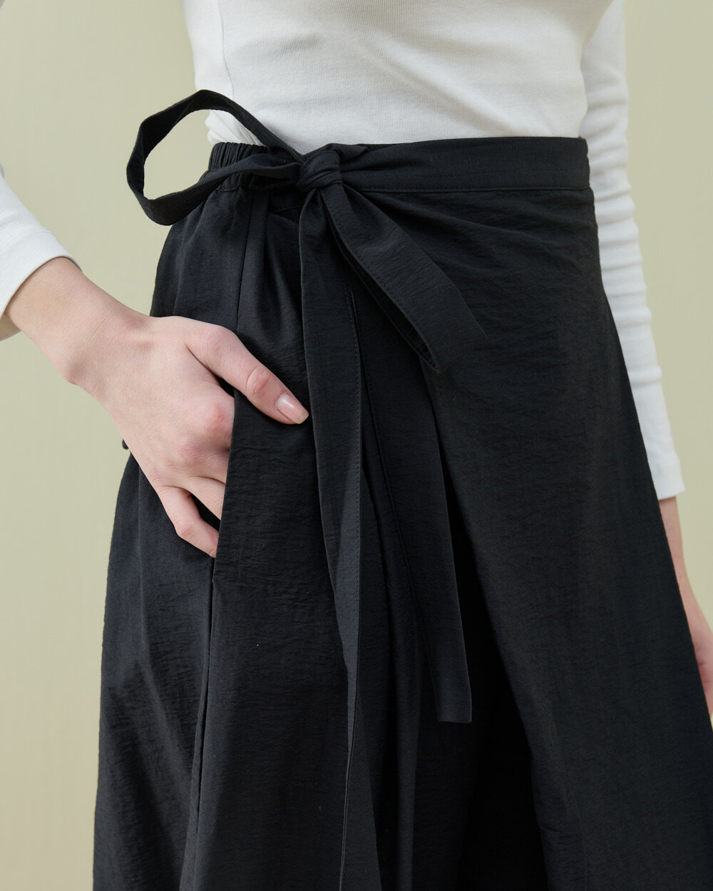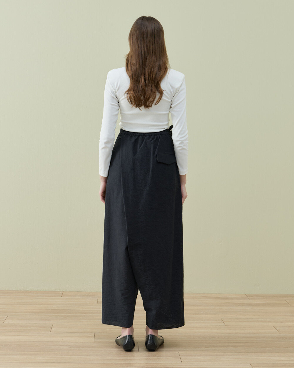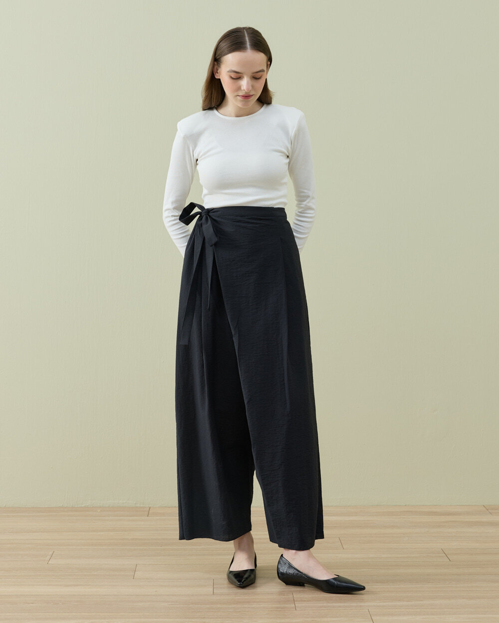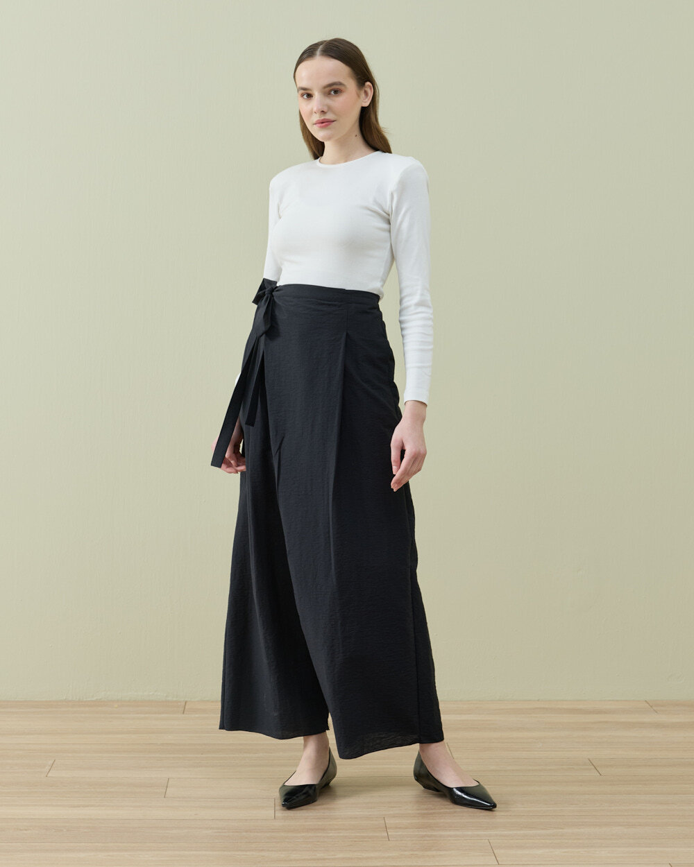 Modern ve özgün tasarımıyla dikkat çeken bu pantolon etek, geniş paça formu ve akıcı duruşuyla zarif bir siluet oluşturur. Etek görünümü veren kapaklı tasarım detayı hareketli ve şık bir görünüm kazandırırken, bel kısmındaki bağlama detayı kullanım kolaylığı sağlar. Günlük stilin yanı sıra daha şık kombinlerde de rahatlıkla tercih edilebilecek zamansız bir parçadır.