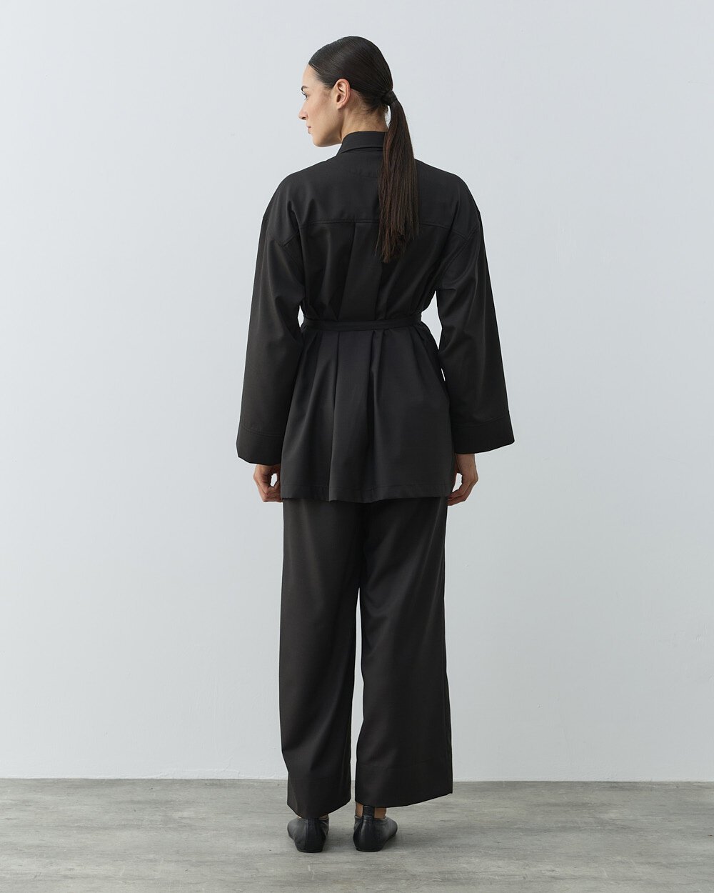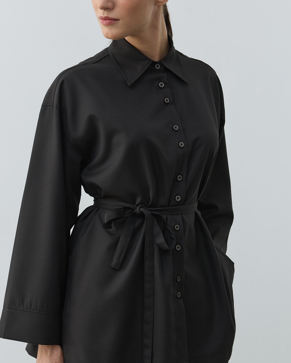 Detay: Klasik gömlek yakadır. Düşük omuzdur. Önü çift düğme kapamalıdır. Geniş manşetlidir. Yanları yırtmaçlıdır. Seyyar kemerlidir.
