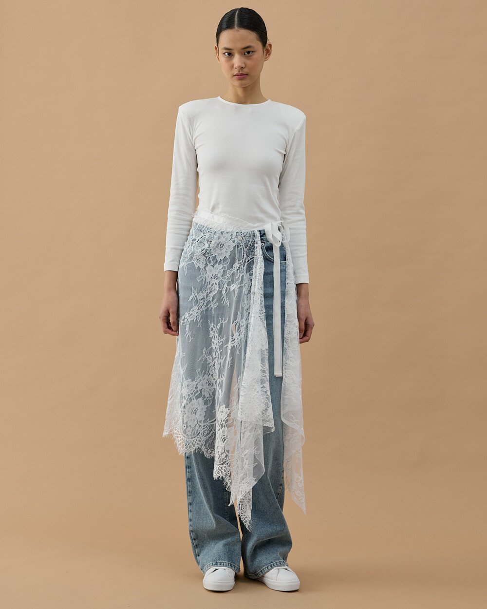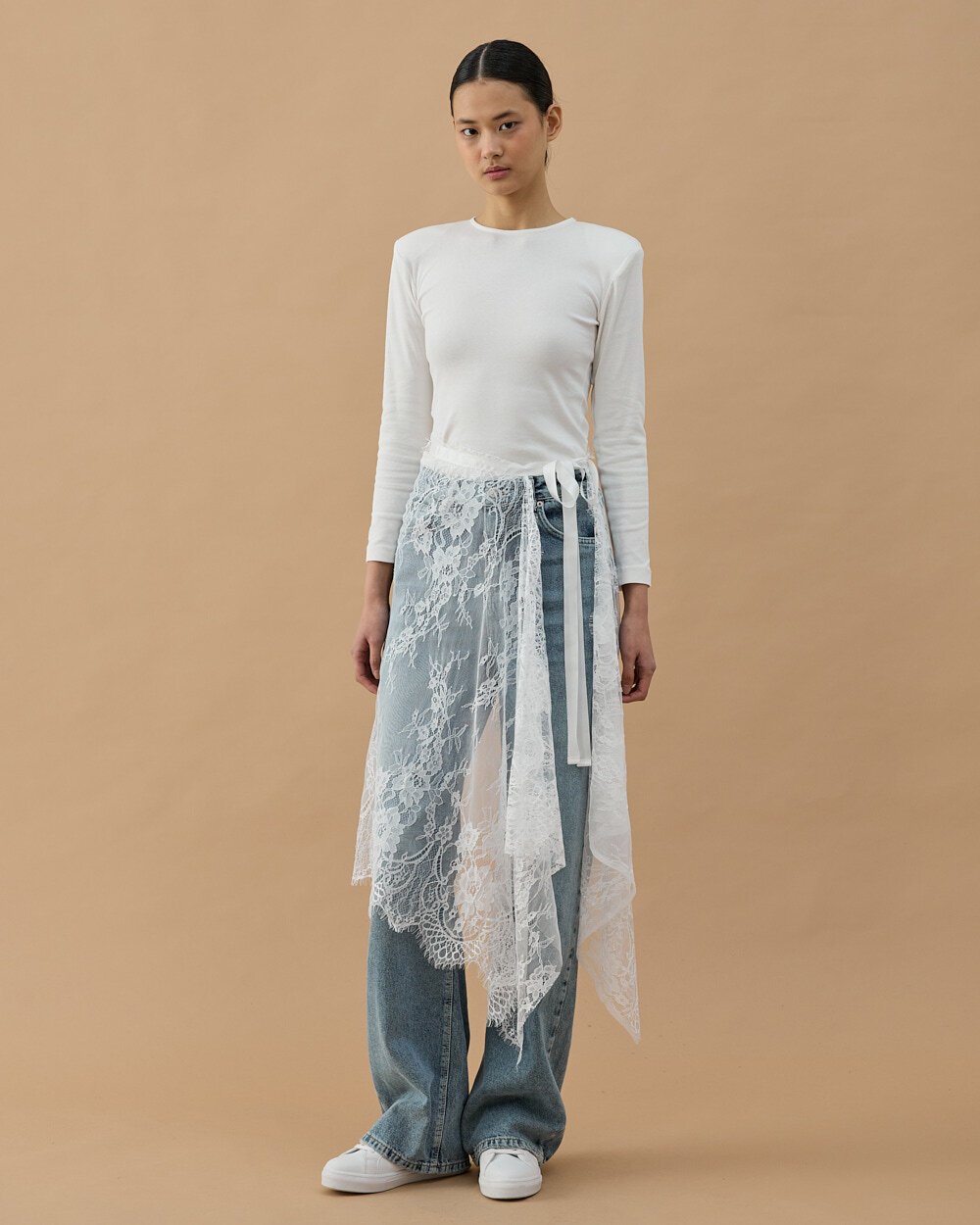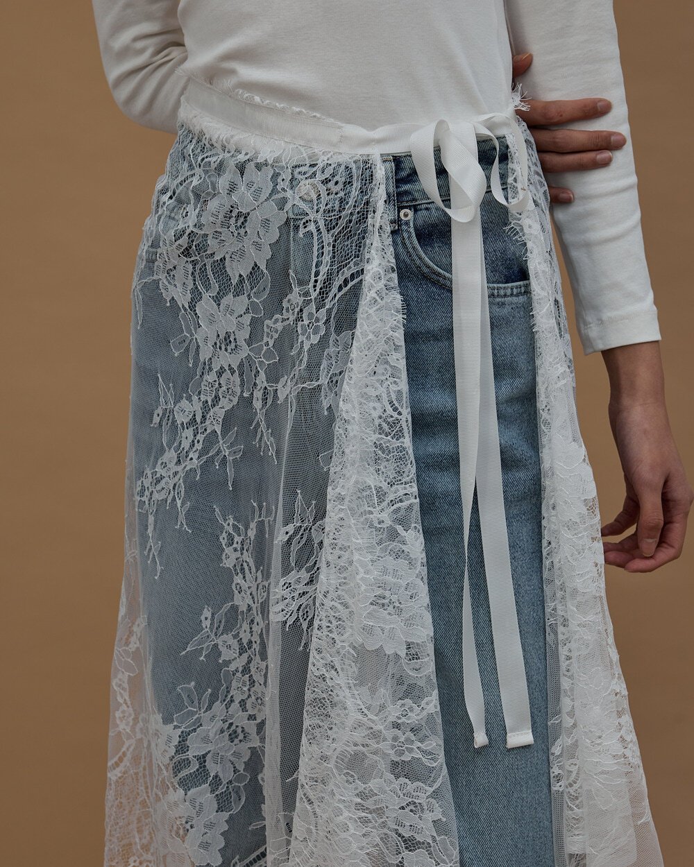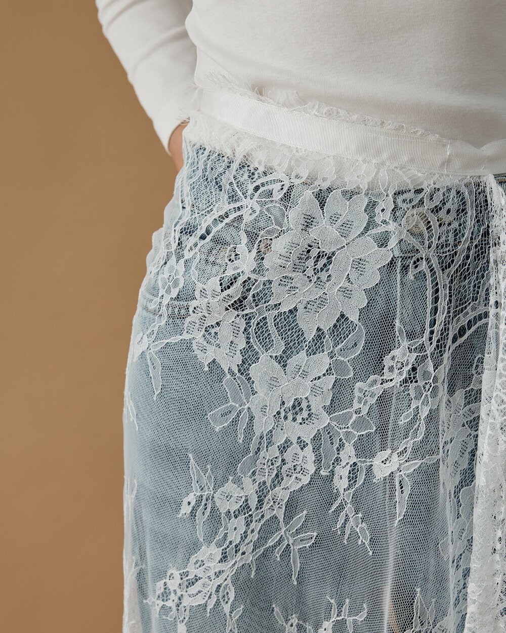 Dantel Pareo Yandan Bağlamalı Uzun İçlik Etek Ekru