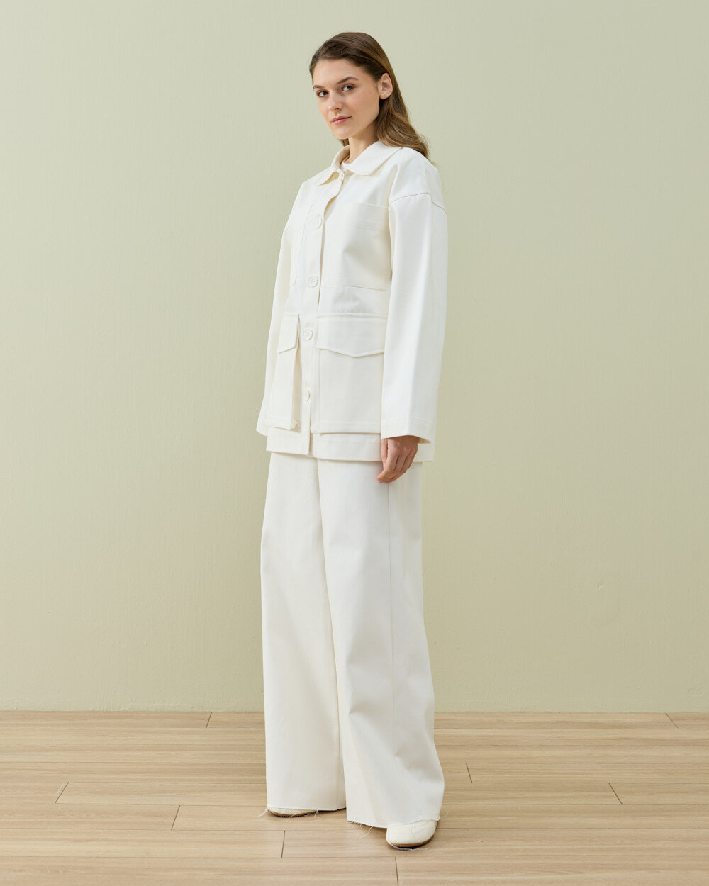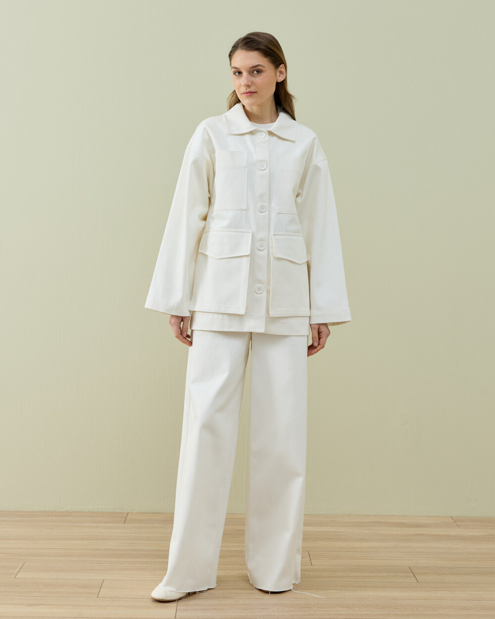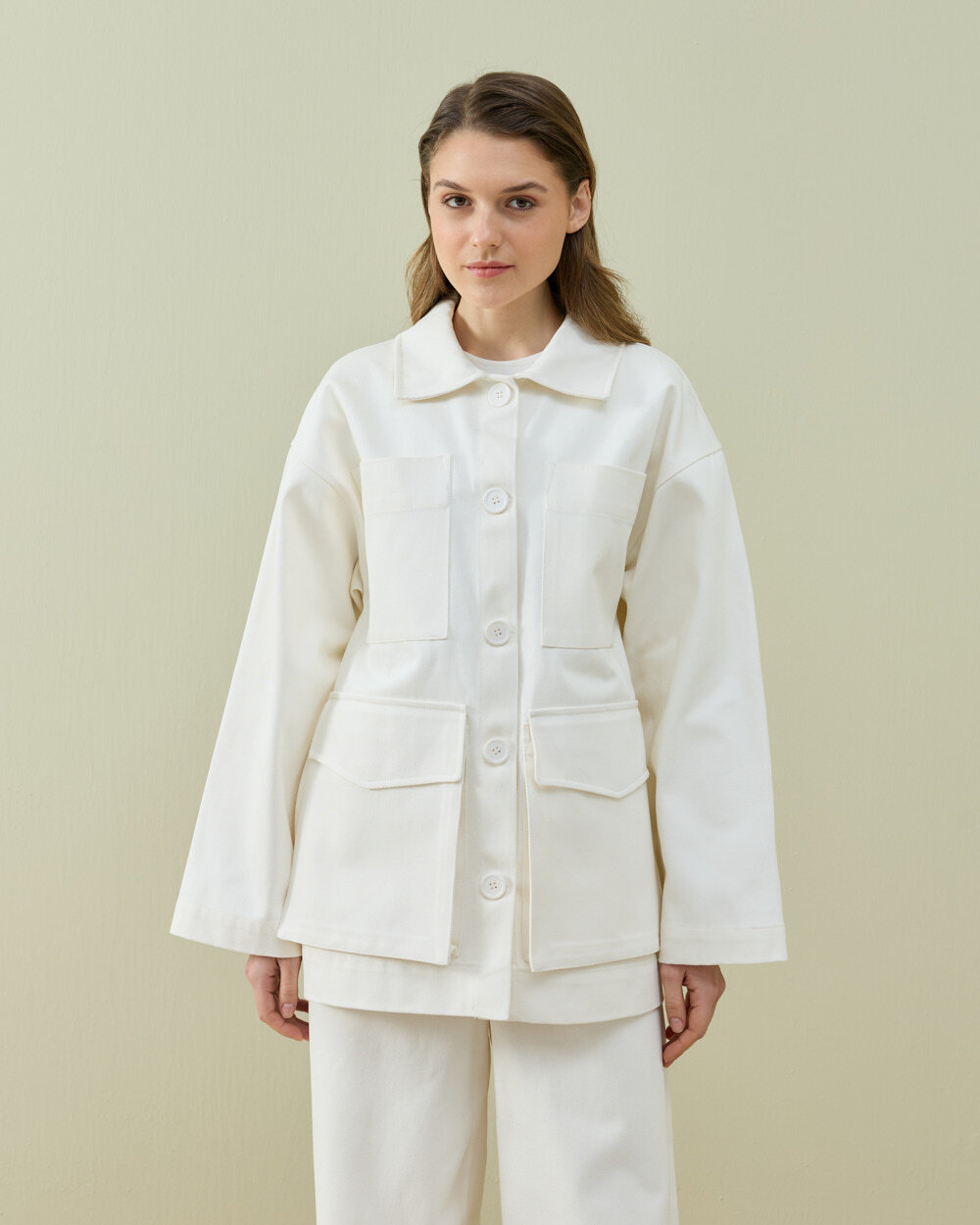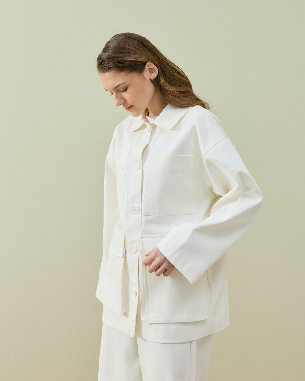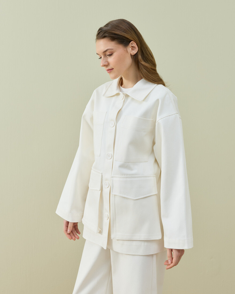 Detay: Fonksiyonel tasarımı ön planda tutan bu ceket, yapılandırılmış formu sayesinde hem tek parça kullanım hem de katmanlı kombinler için uygundur. Ön yüzeyde yer alan düğmeli kapama sistemi, kullanım kolaylığı sağlarken klasik bir görünüm sunar. Bel hattında bulunan bağcık detayı, vücuda göre ayarlanabilir bir siluet oluşturarak farklı kullanım stillerine imkan tanır. Ön bölümde konumlandırılmış kapaklı cepler, hem fonksiyonel depolama alanı sunar hem de tasarıma dengeli bir hacim kazandırır. Düz yaka formu ve uzun kol yapısı, zamansız bir ceket silueti oluşturur. Orta ağırlıktaki kumaş yapısı sayesinde mevsim geçişlerinde rahatlıkla kullanılabilecek çok yönlü bir dış giyim ürünüdür.