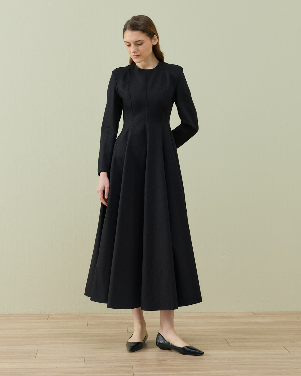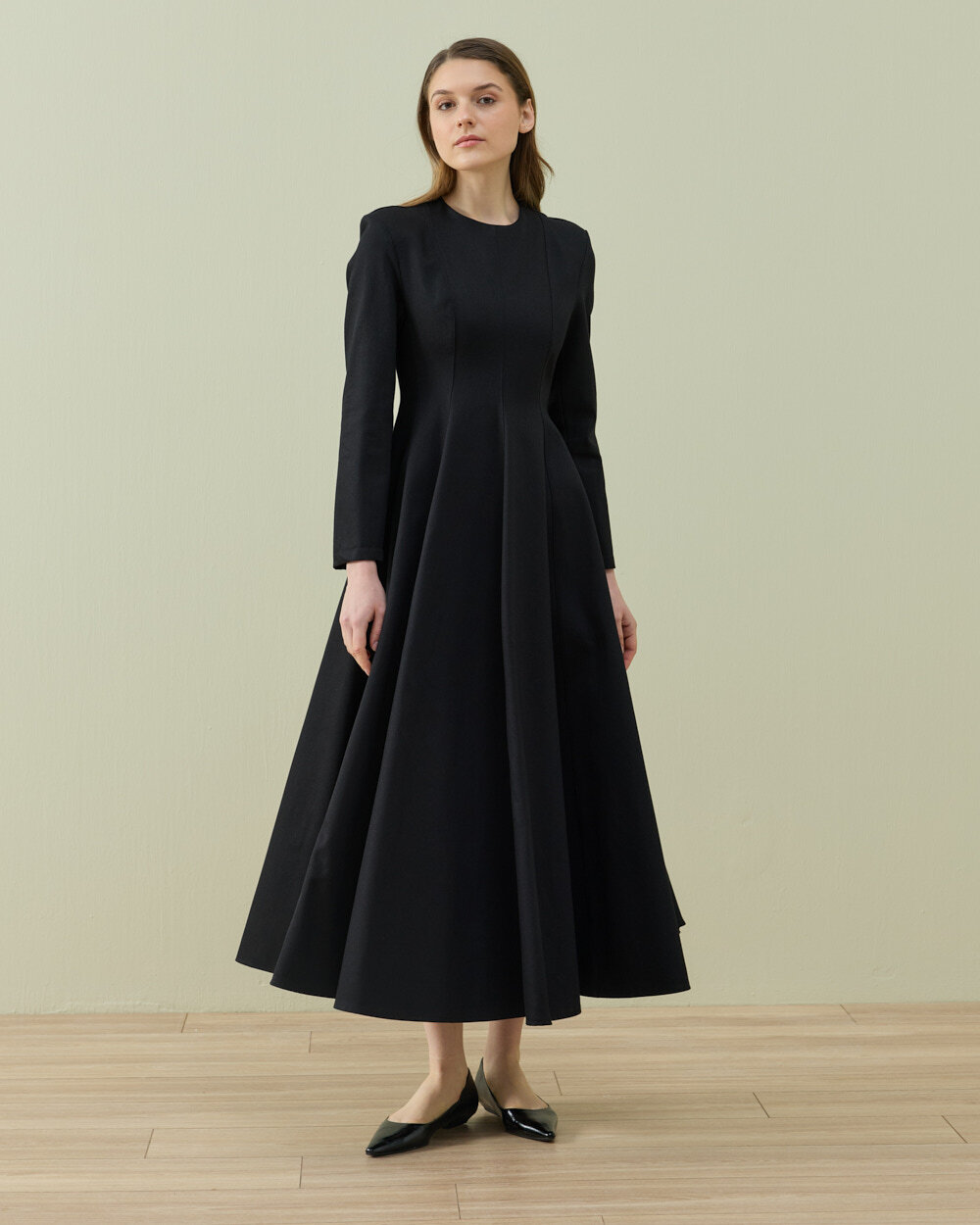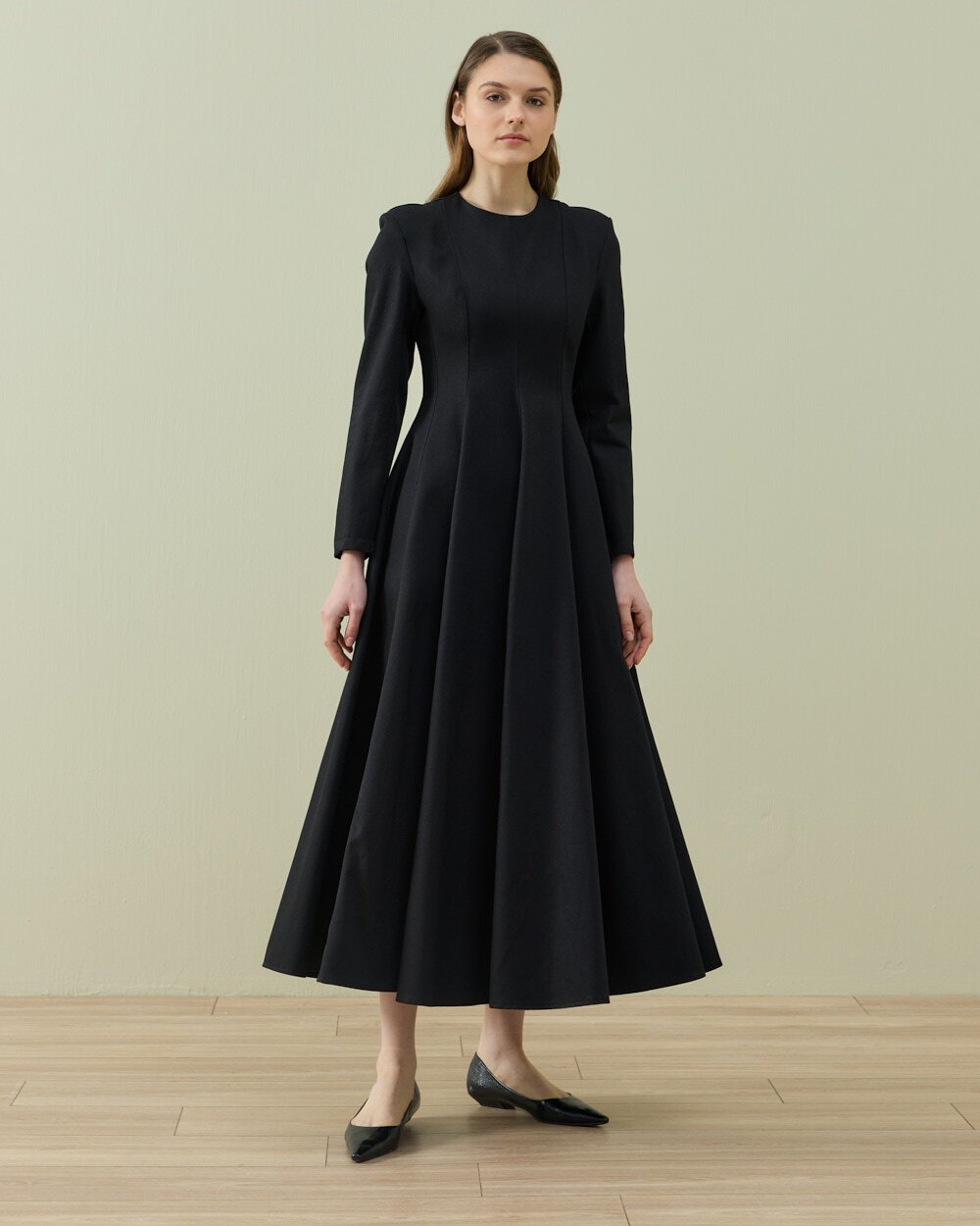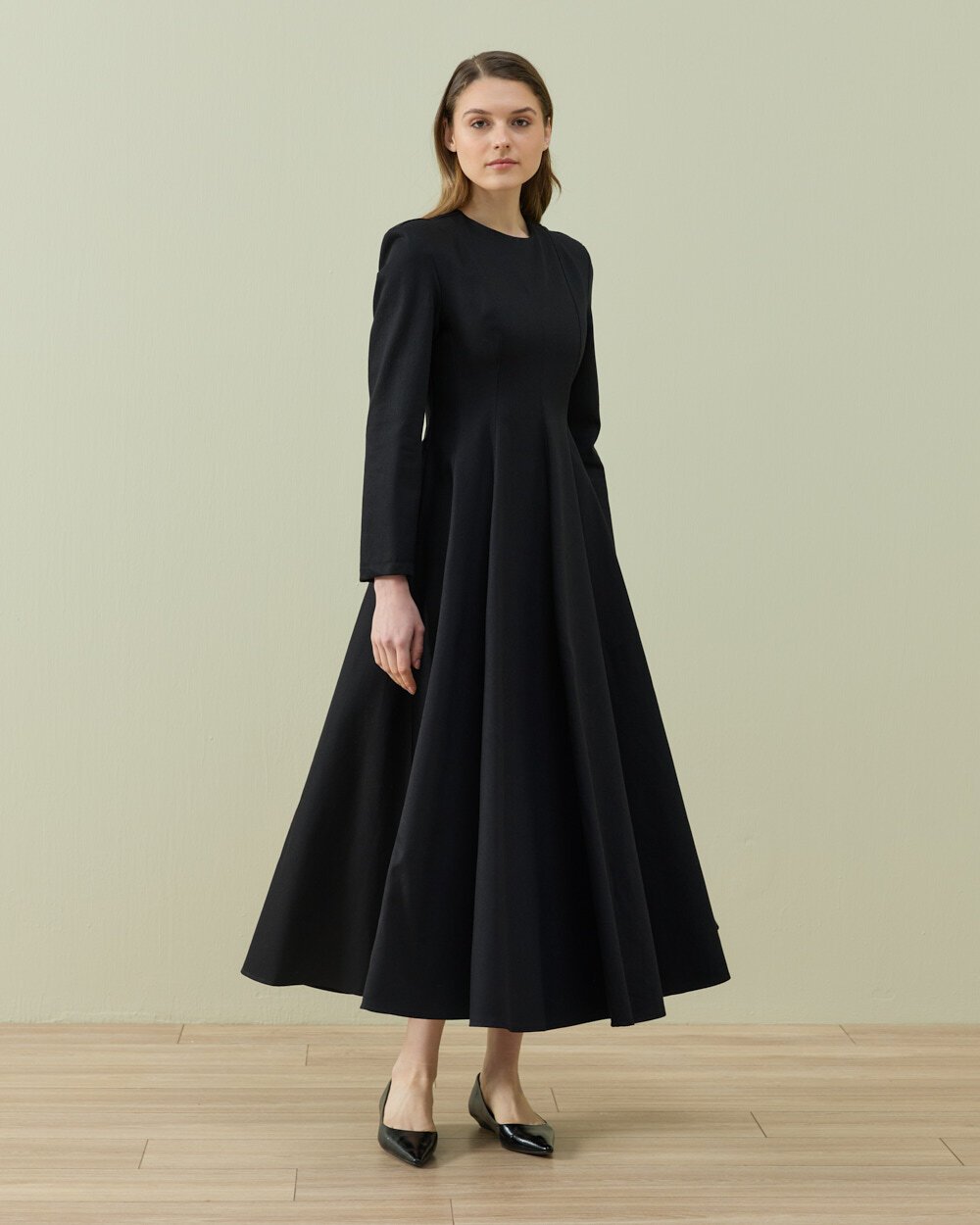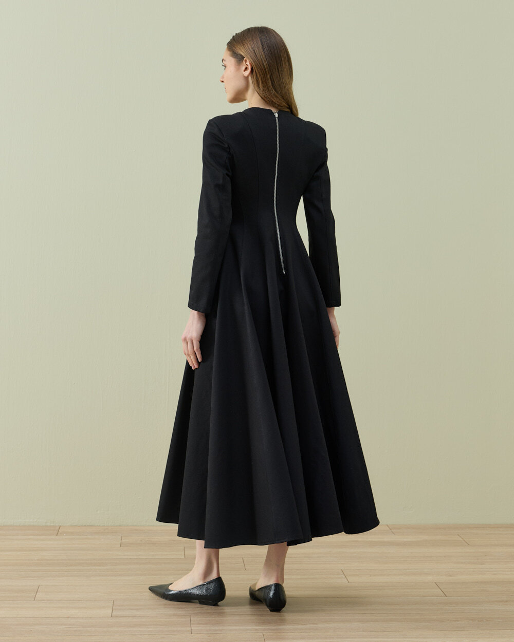 Zarif ve akıcı siluetiyle öne çıkan bu uzun elbise, sade tasarımıyla zamansız bir şıklık sunar. Belden aşağı doğru genişleyen formu hareketli ve feminen bir görünüm kazandırırken, uzun kol yapısı gün boyu konforlu bir kullanım sağlar. Minimal tasarımı sayesinde hem günlük stil hem de özel gün kombinleri için şık bir alternatif oluşturur.
