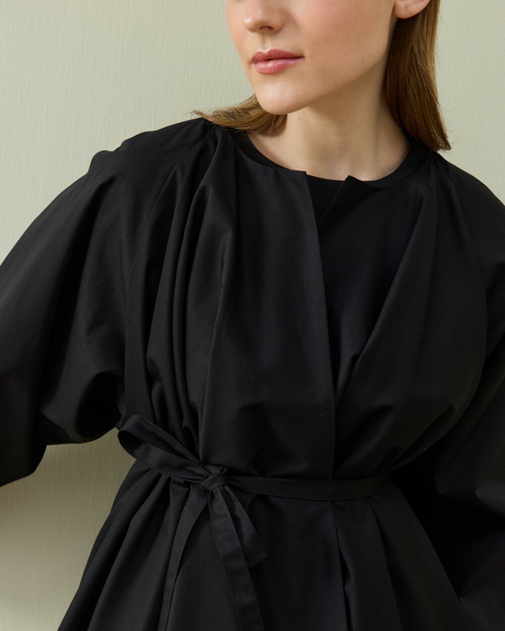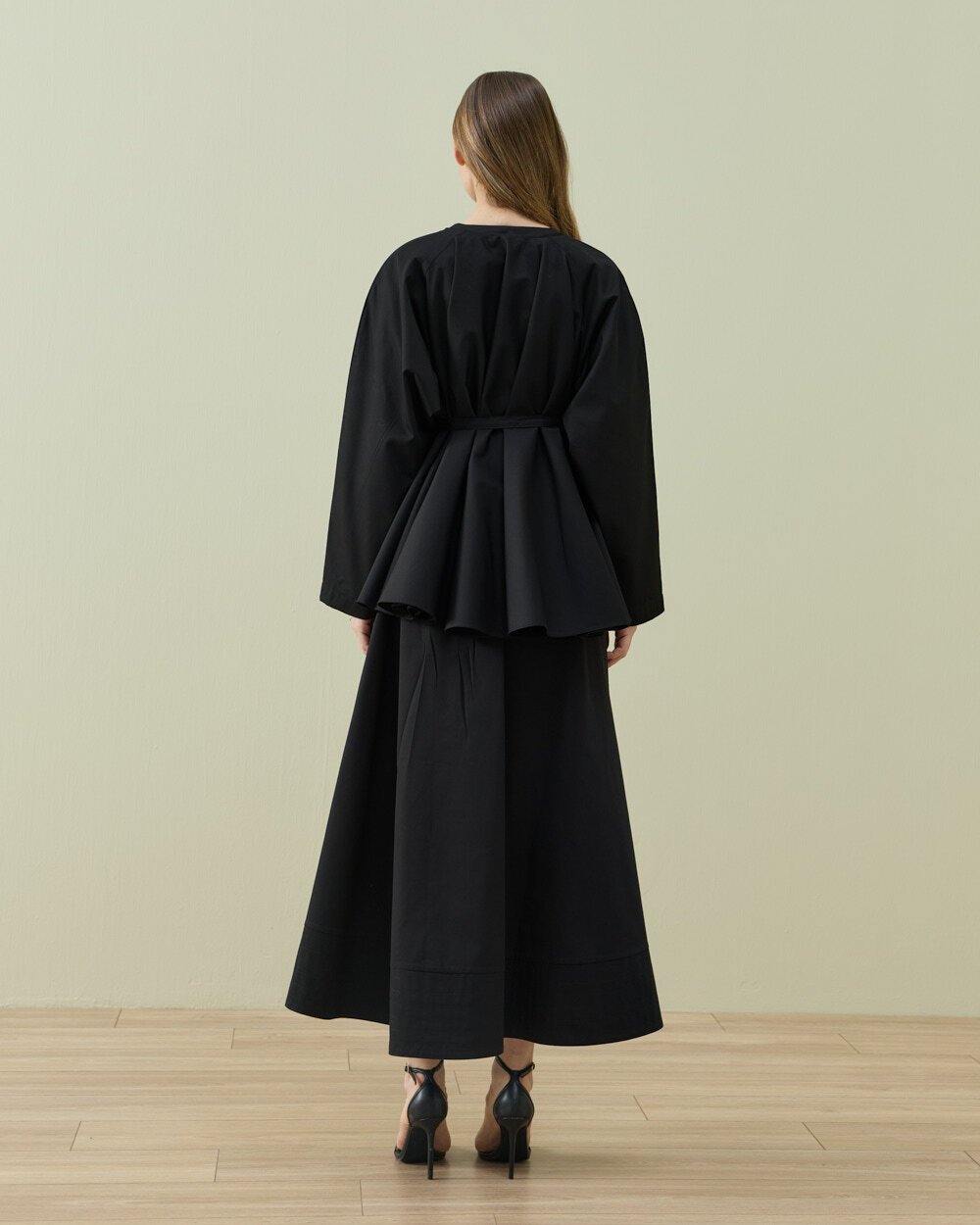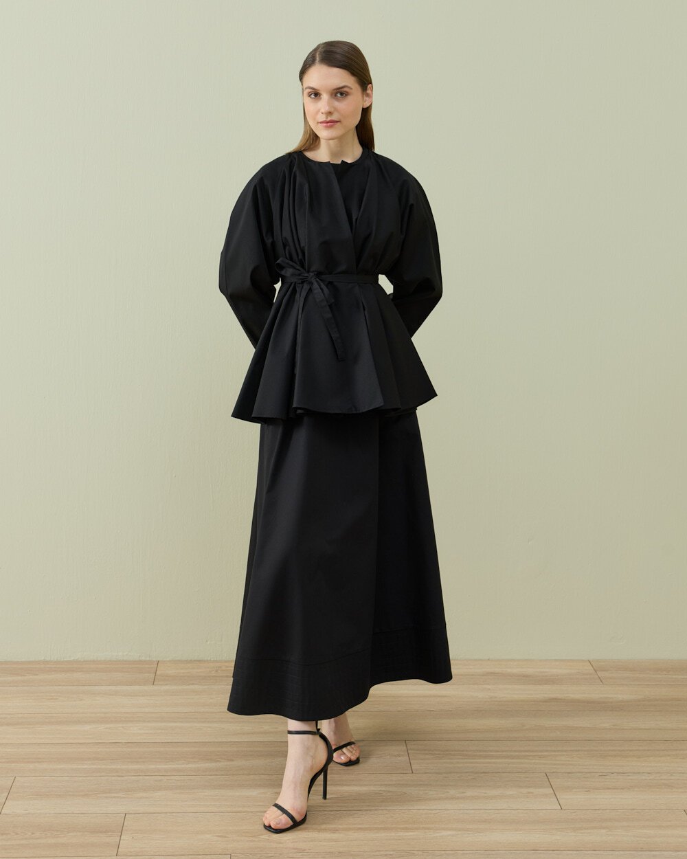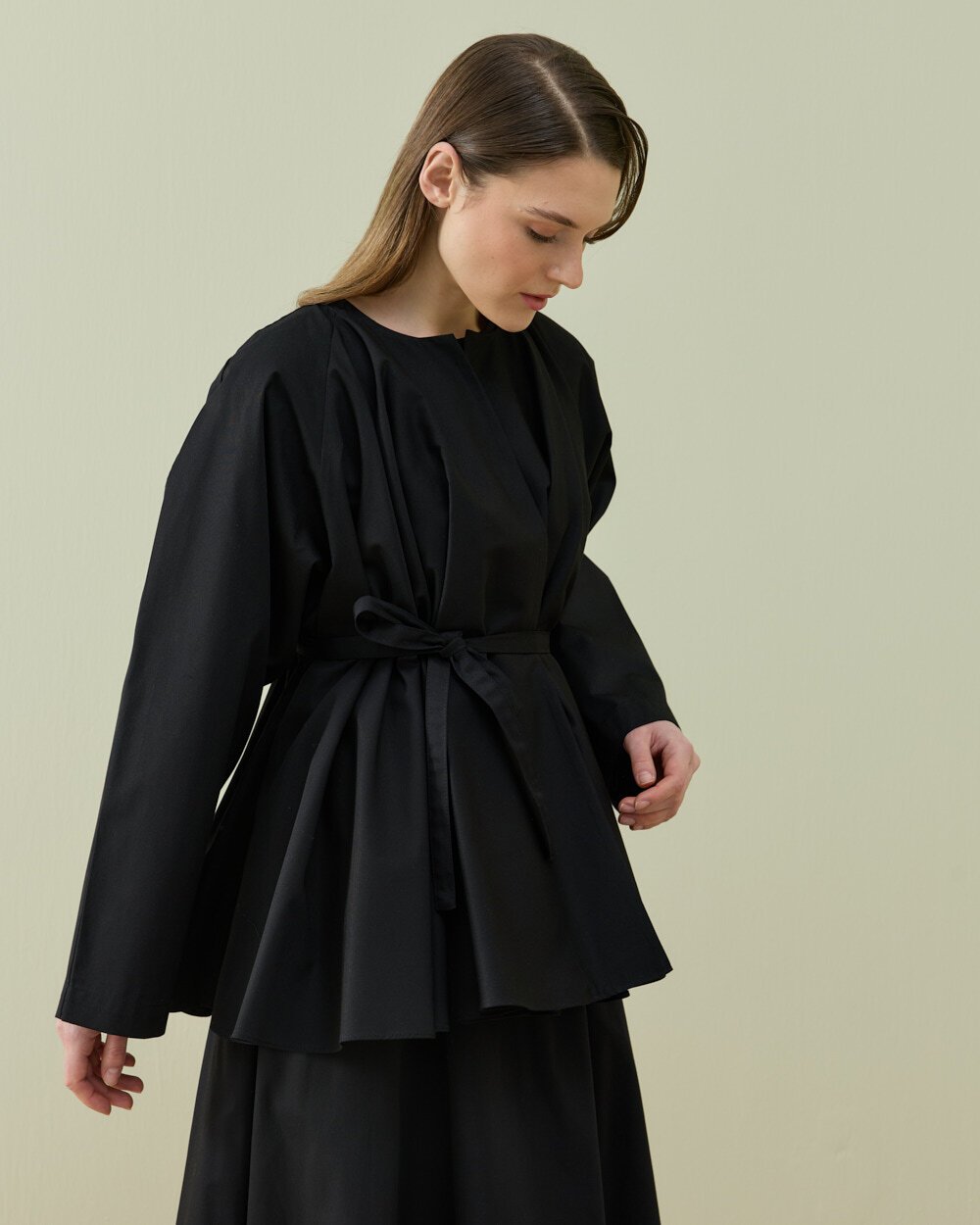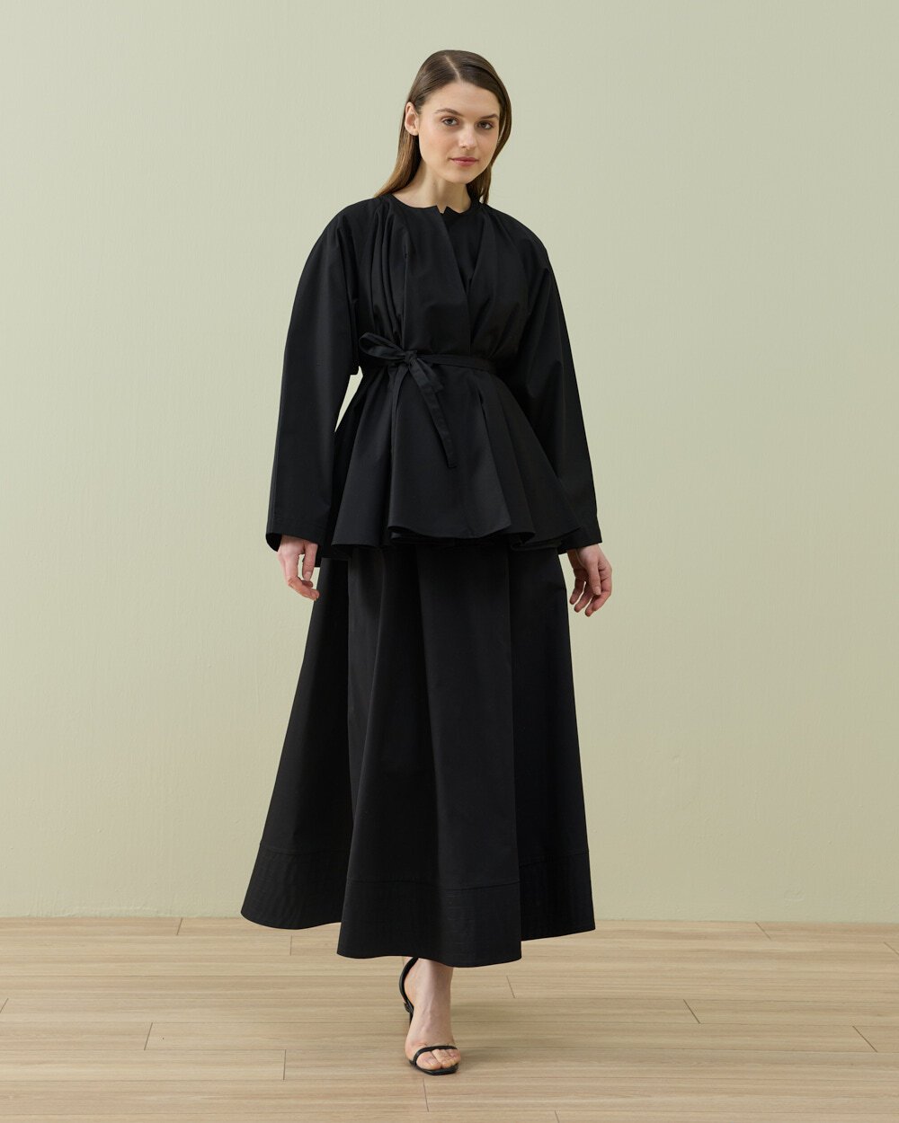Detay: Ön bedende çok volanlı yapı ile form kazandırılmıştır. Bel kısmı ayarlanabilir bağlama detayı ile vücuda göre şekillendirilebilir. Yuvarlak yaka formu ile sade ve dengeli bir üst yapı sunar. Volanlı kesim bel hattından itibaren kontrollü hacim oluşturarak hareketli bir siluet sağlar. Uzun kol yapısı rahat kullanım için düz kesim olarak tasarlanmıştır. Dikiş ve volan geçişleri formu koruyacak şekilde güçlendirilmiştir.