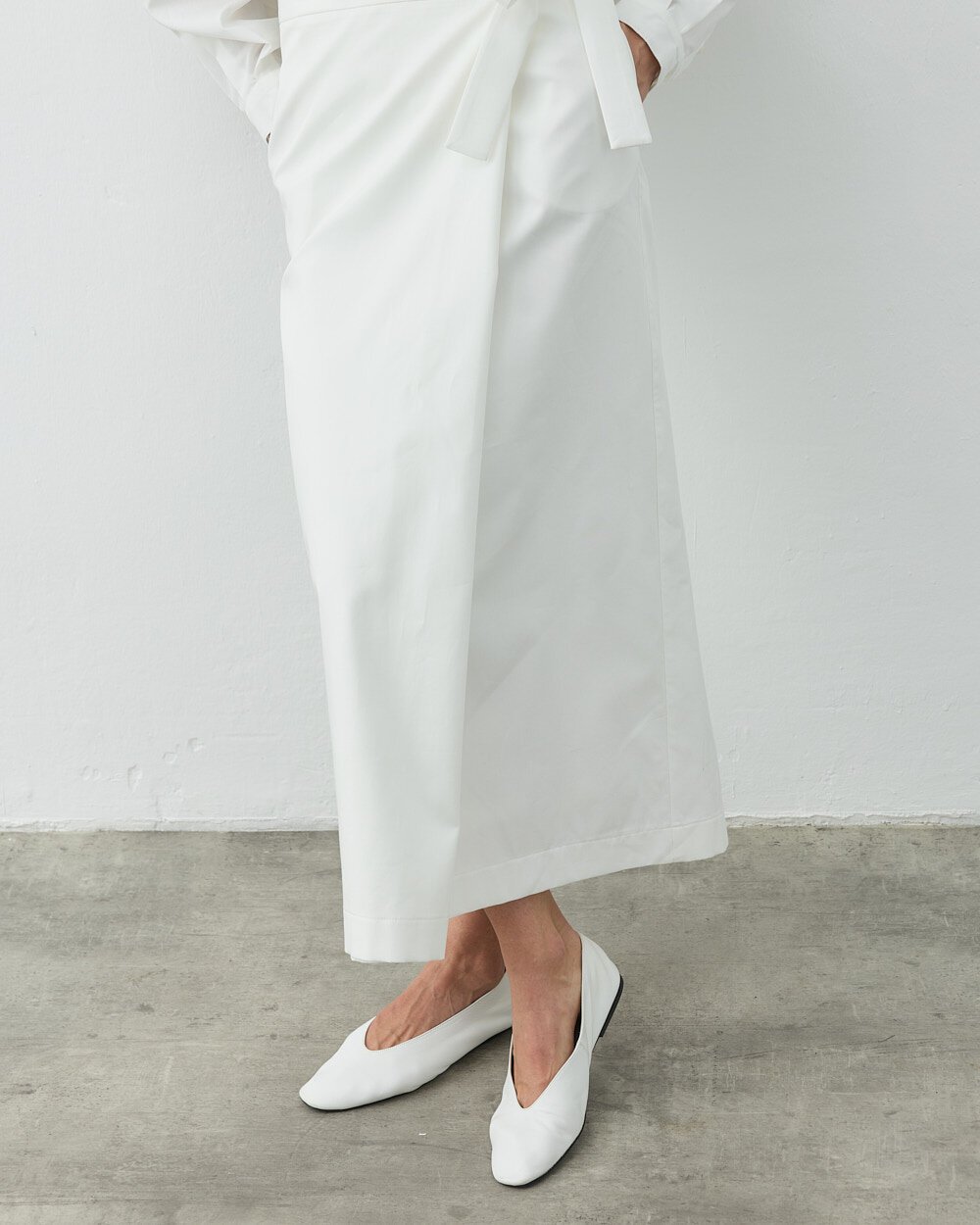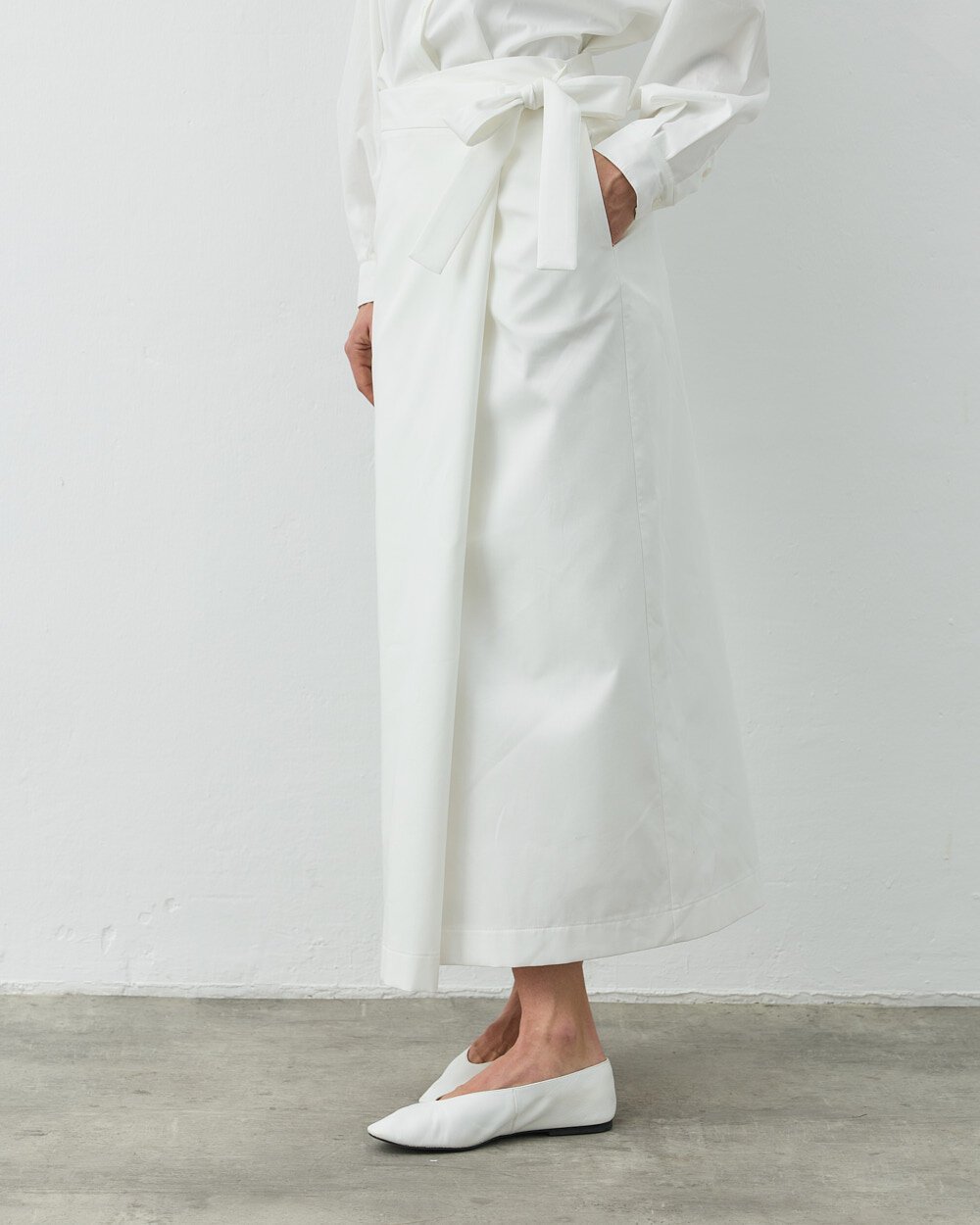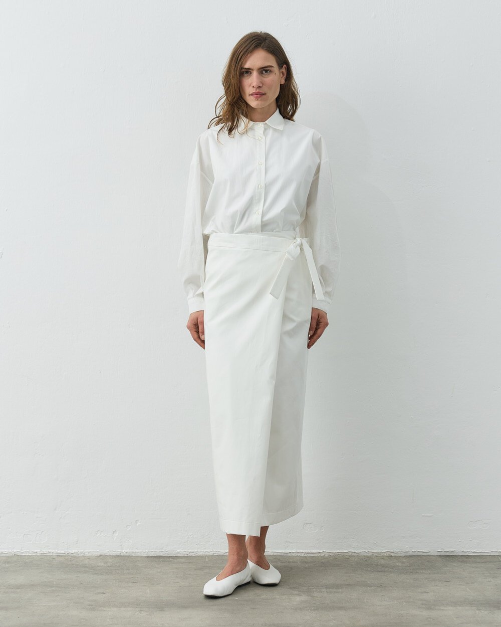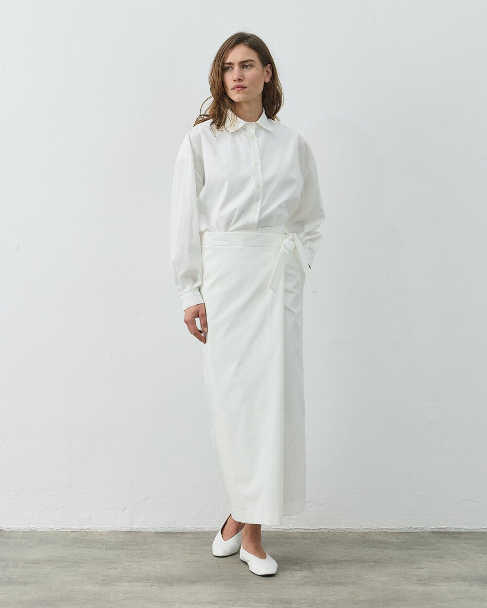 Modern sarmal formdan ilham alan bu etek, yandan bağlamalı kapama detayı ile fonksiyonel ve ayarlanabilir bir kullanım sunar. Ön panelde yer alan kapaklı yapı, eteğe katmanlı bir görünüm kazandırırken aynı zamanda kontrollü bir hareket alanı sağlar. Bel hattındaki bağlama detayı sayesinde vücuda göre kişisel ayar yapılabilir ve bel formu net şekilde tanımlanır. Düz ve temiz hatlı silueti, minimal bir duruş sunarken uzun boy tasarımı ile dengeli bir oran oluşturur. Orta ağırlıktaki gabardin dokuma kumaş yapısı, formunu koruyan tok bir duruş sağlarken gün boyu konforlu kullanım imkânı sunar. Yan kapama sistemi sayesinde hem fonksiyonel hem de tasarımsal bir farklılık yaratan, çok yönlü bir alt giyim parçasıdır.