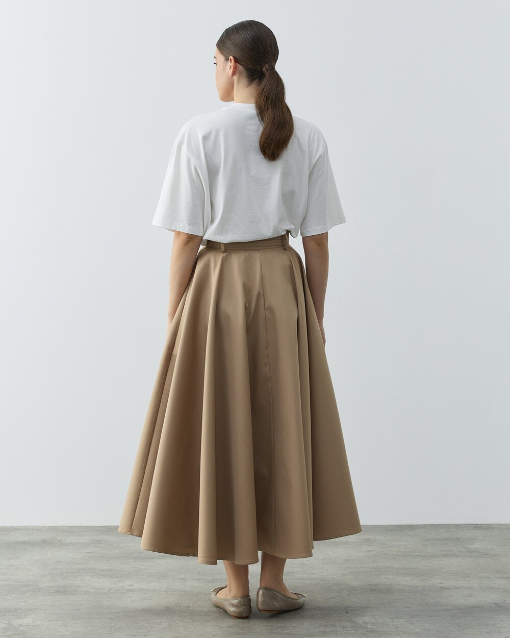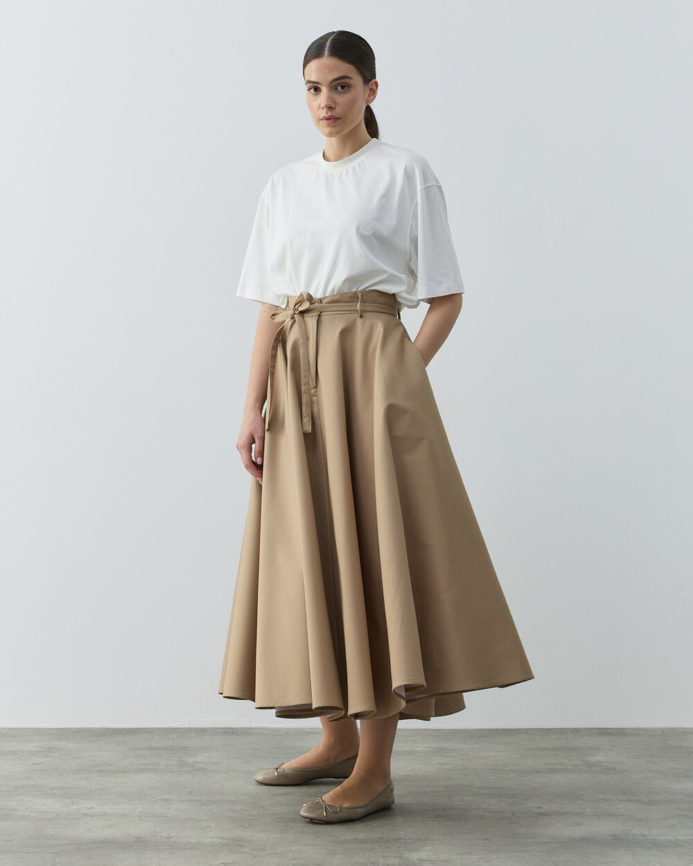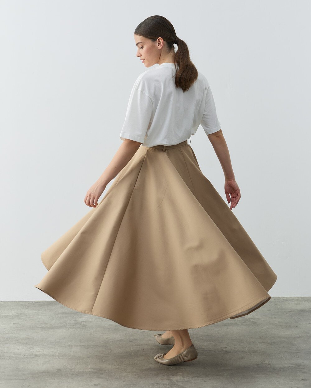 Detay: Paper gabardin dokuma kumaştan üretilmiştir. Tam kloş kalıp yapısı sayesinde hareketli ve dengeli bir duruş sunar. Ön patlı tasarımı ile temiz ve sade bir görünüm elde edilmiştir. Bel kısmında yer alan kuşak detayı, bele göre ayarlanabilir kullanım imkânı sağlar. Yüksek bel formu vücut hatlarını dengelerken, etek boyu günlük ve şehir kullanımına uygun şekilde tasarlanmıştır. Dokuma yapısı formunu korur, gün boyu konforlu bir kullanım sunar. Farklı üst giyim ürünleri ile kolaylıkla kombinlenebilir.