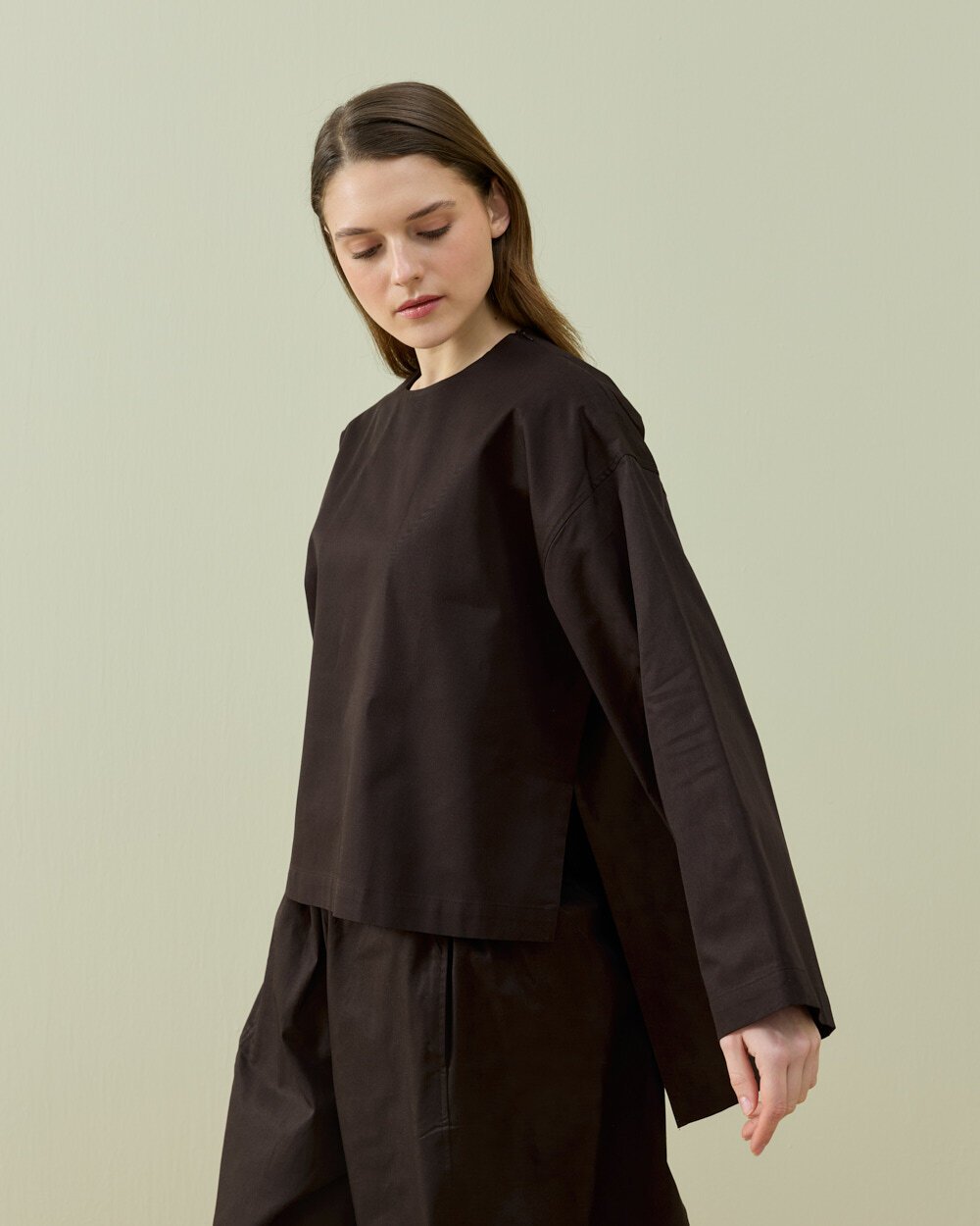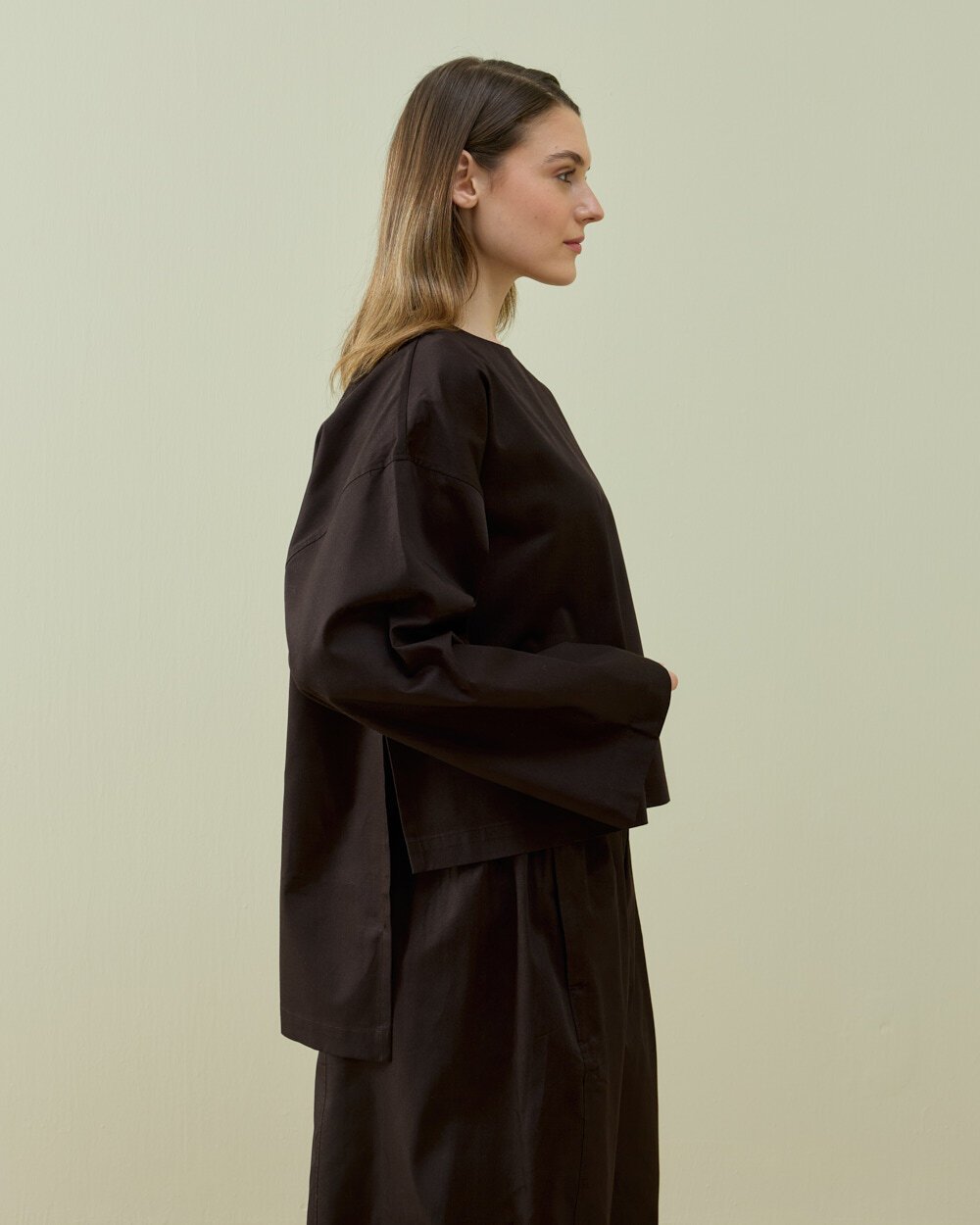 Minimal ve modern tasarımıyla öne çıkan bu bluz, rahat kalıbı ve sade duruşuyla günlük stilin tamamlayıcı parçalarından biridir. Yan yırtmaç detayı hareket özgürlüğü sağlarken tasarıma dinamik bir görünüm kazandırır. Uzun kol yapısı ve zamansız formu sayesinde farklı alt giyim parçalarıyla kolayca kombinlenebilir.