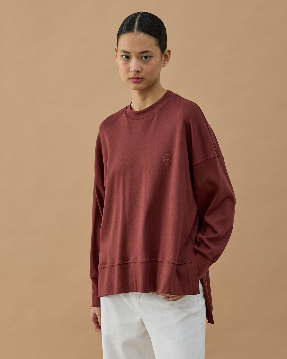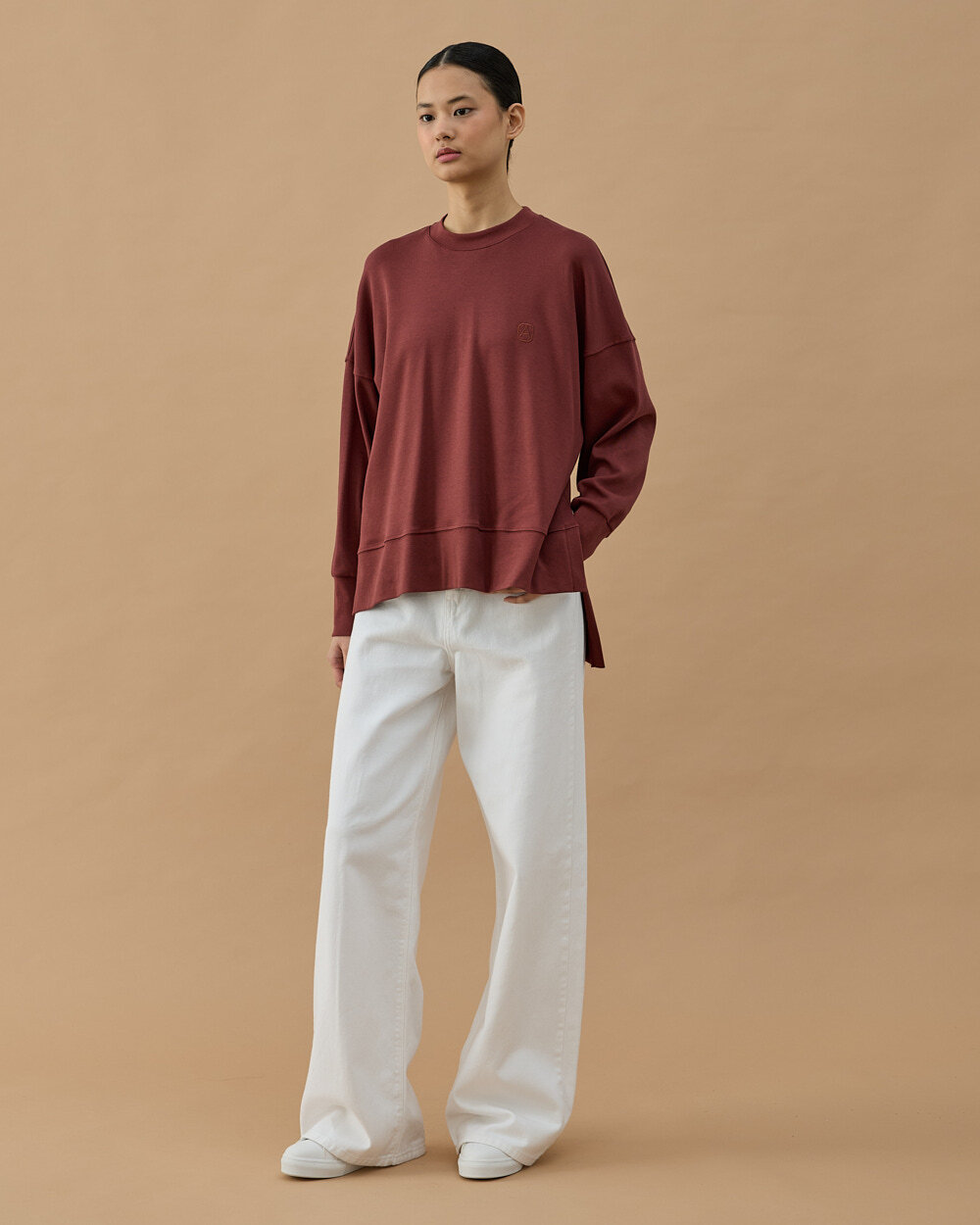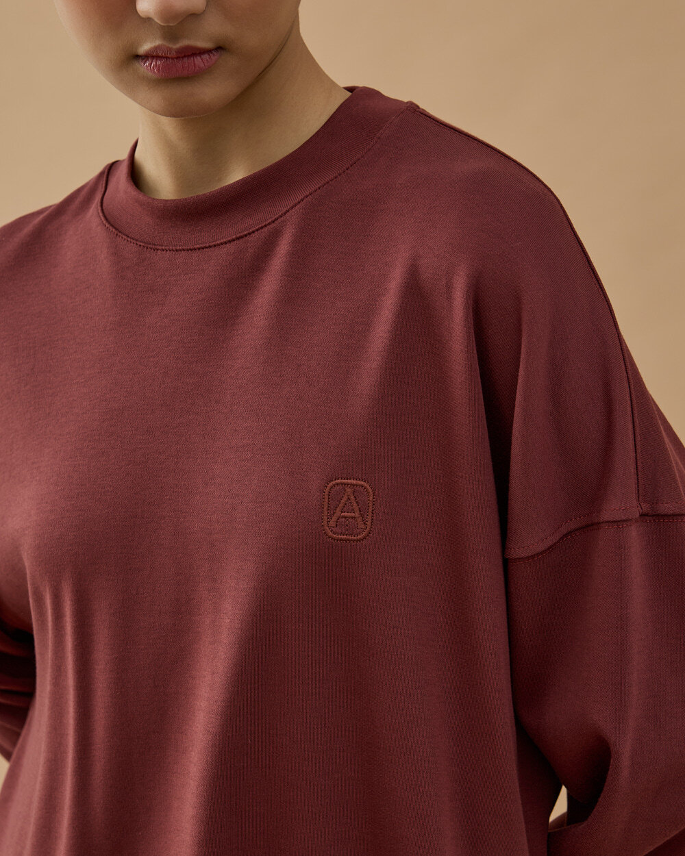 Düşük omuz detayı ve geniş kalıbı ile özgür bir siluet oluştururken, yan yırtmaç tasarımı ürüne dinamik bir görünüm kazandırır. Rib bitişli etek ucu ve kol detayları ise sportif ve modern bir bütünlük sağlar. Minimal nakış detayı ile sade şıklık tamamlanır.