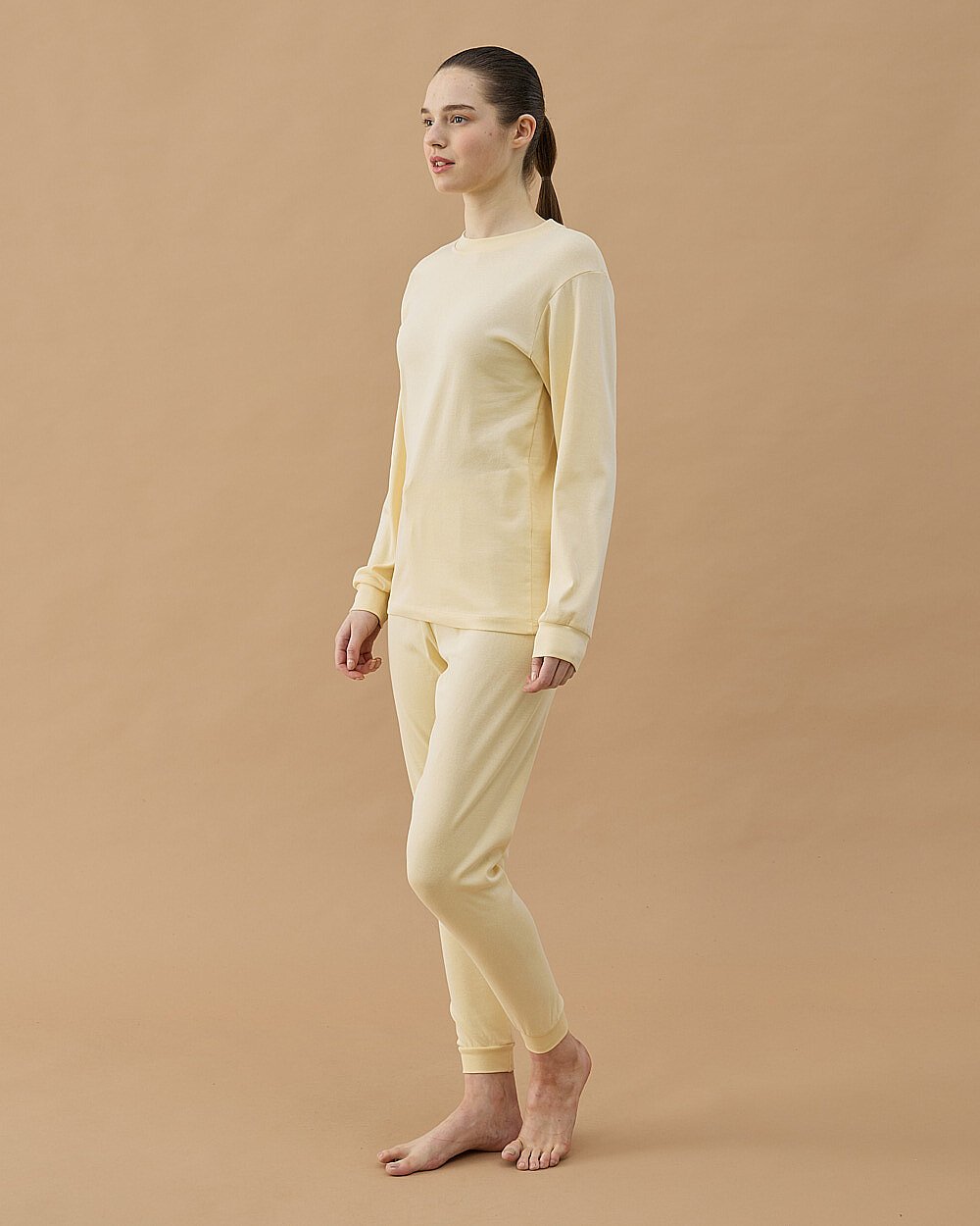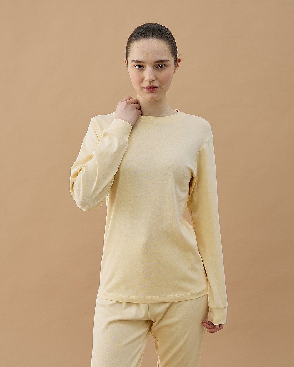 Yumuşak dokulu ribana kumaşıyla öne çıkan bu jogger pijama takımı, gün boyu konforlu bir kullanım sunar. Esnek yapısı sayesinde vücuda uyum sağlar ve rahat hareket imkanı verir. Üst parçada sade ve minimal tasarım tercih edilirken, alt parçada lastikli paça detayı ile modern bir görünüm elde edilmiştir.