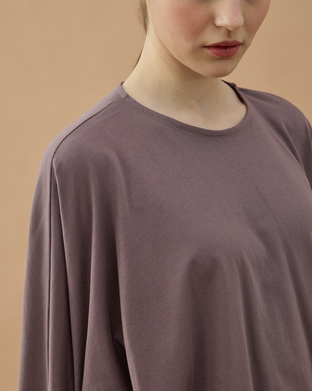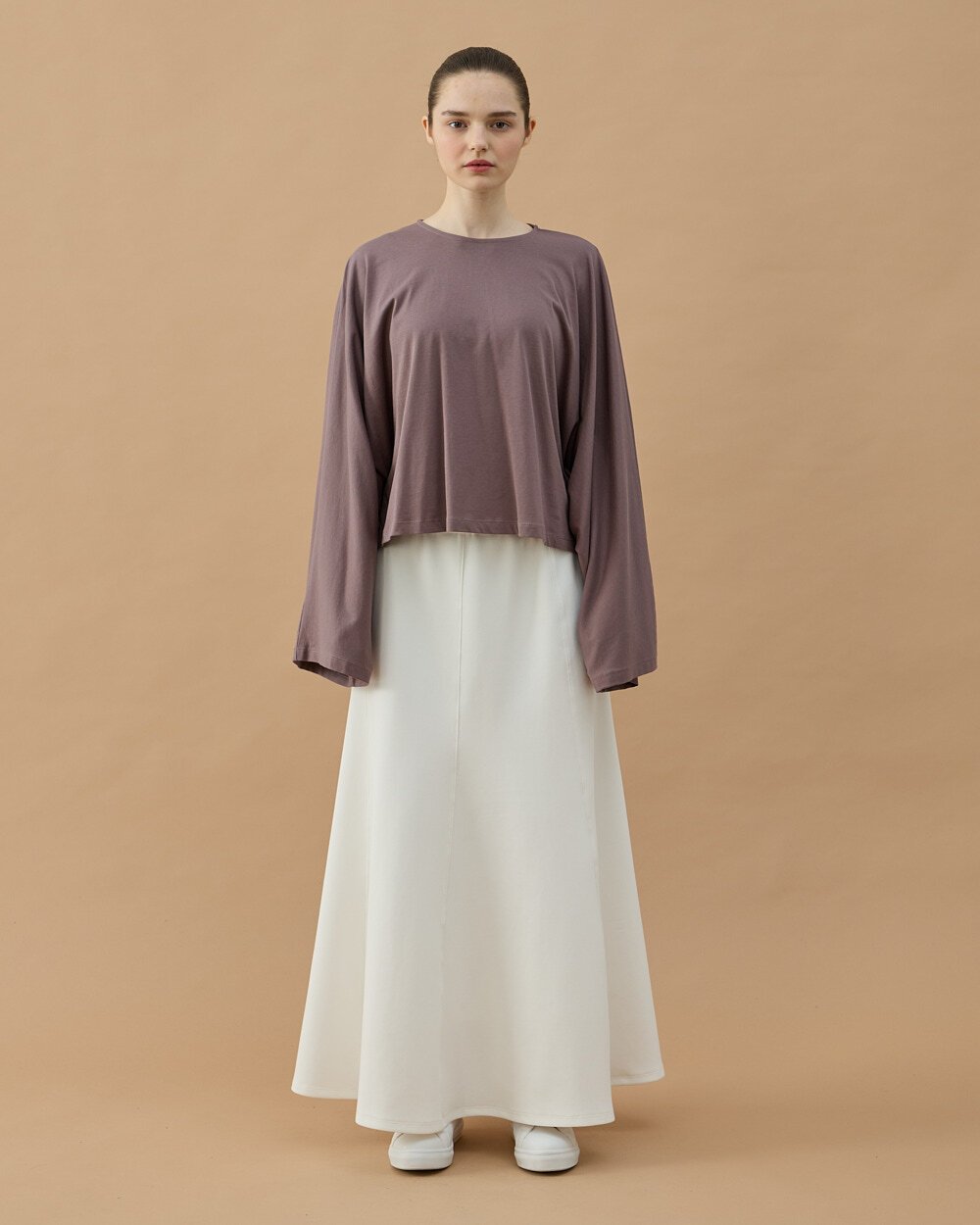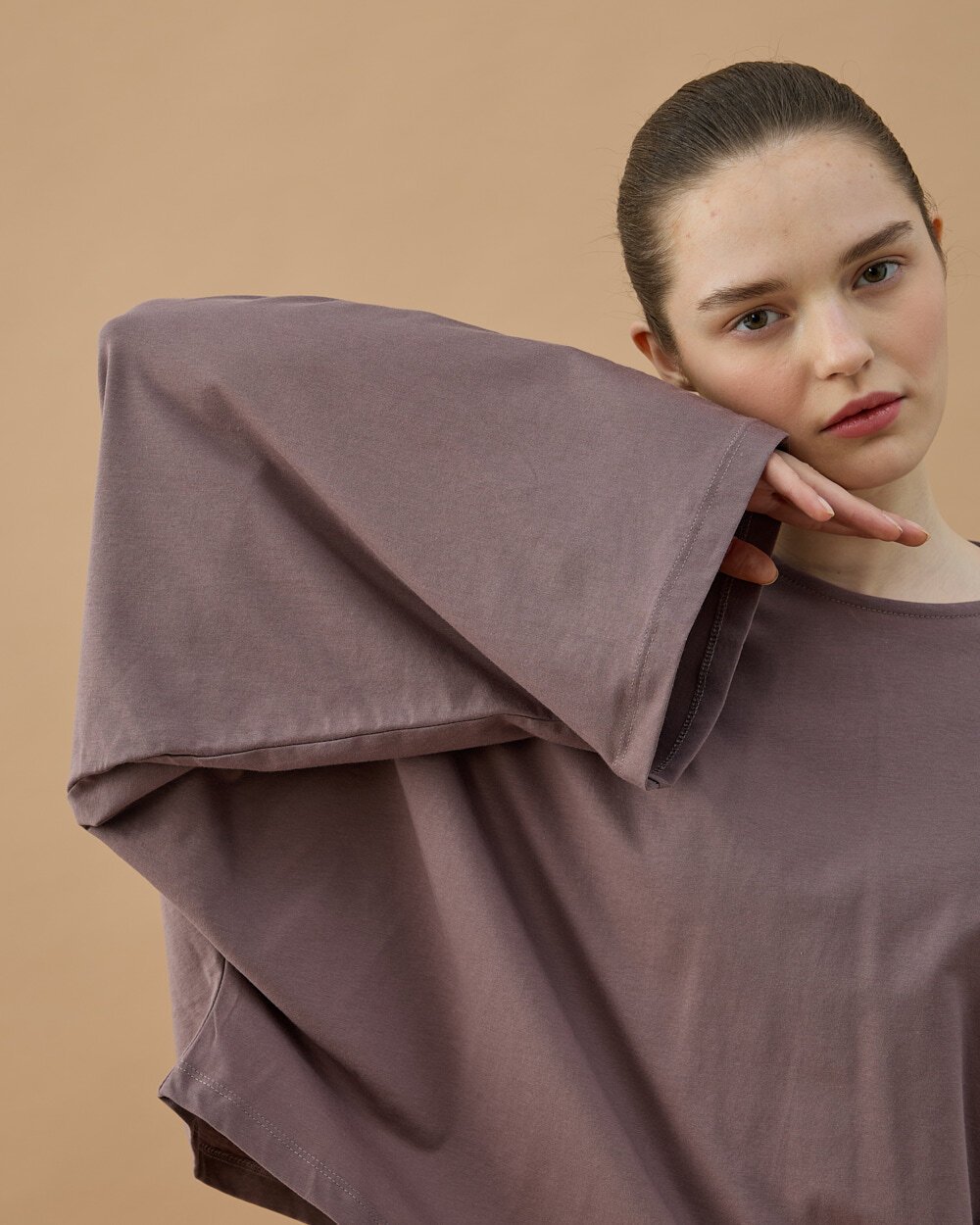 Modern ve minimal tasarımıyla öne çıkan bu crop bluz, rahat kalıbı ve akıcı kumaş yapısıyla gün boyu konfor sağlar. Pelerin formundaki geniş kol tasarımı sayesinde hareketli ve zarif bir görünüm sunar. Crop boy kesimi sayesinde etek ve pantolonlarla kolayca kombinlenebilir.