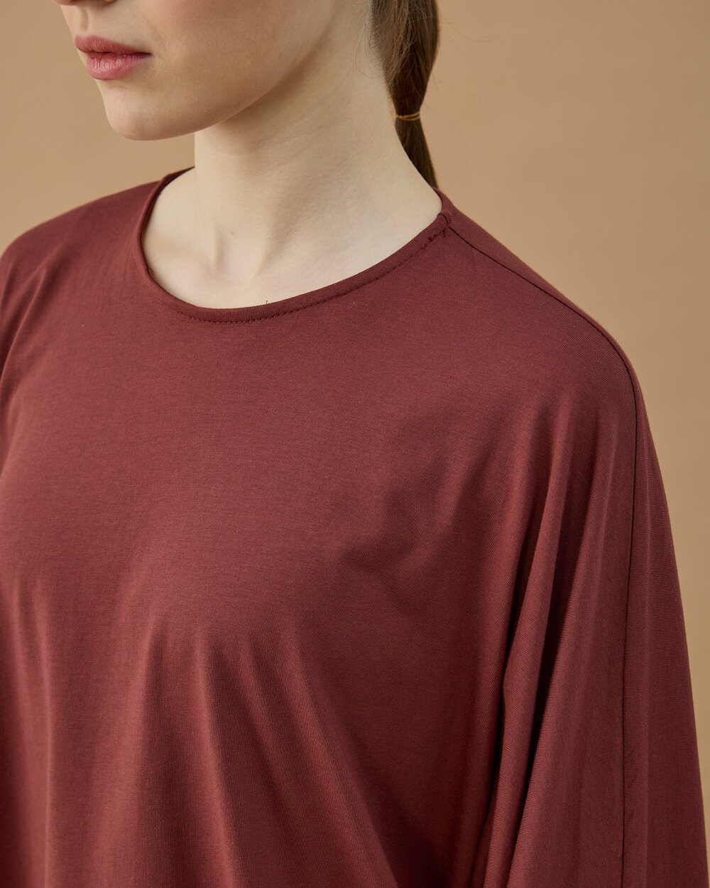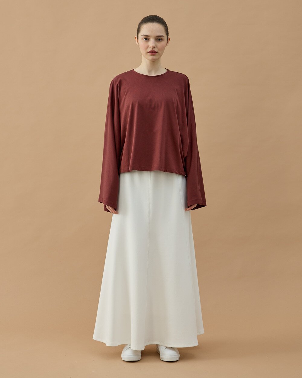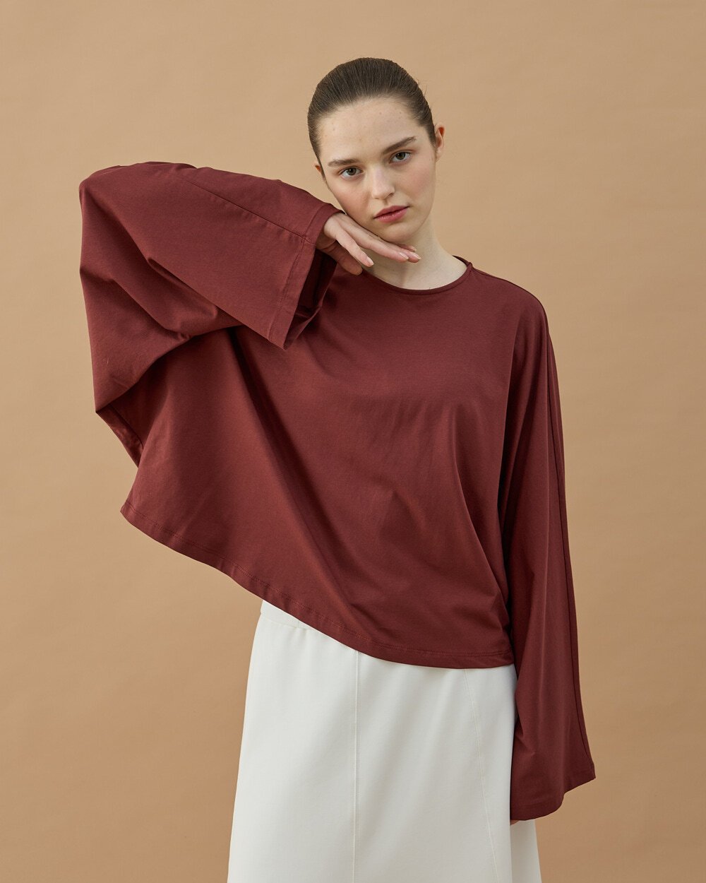 Modern ve minimal tasarımıyla öne çıkan bu crop bluz, rahat kalıbı ve akıcı kumaş yapısıyla gün boyu konfor sağlar. Pelerin formundaki geniş kol tasarımı sayesinde hareketli ve zarif bir görünüm sunar. Crop boy kesimi sayesinde etek ve pantolonlarla kolayca kombinlenebilir.