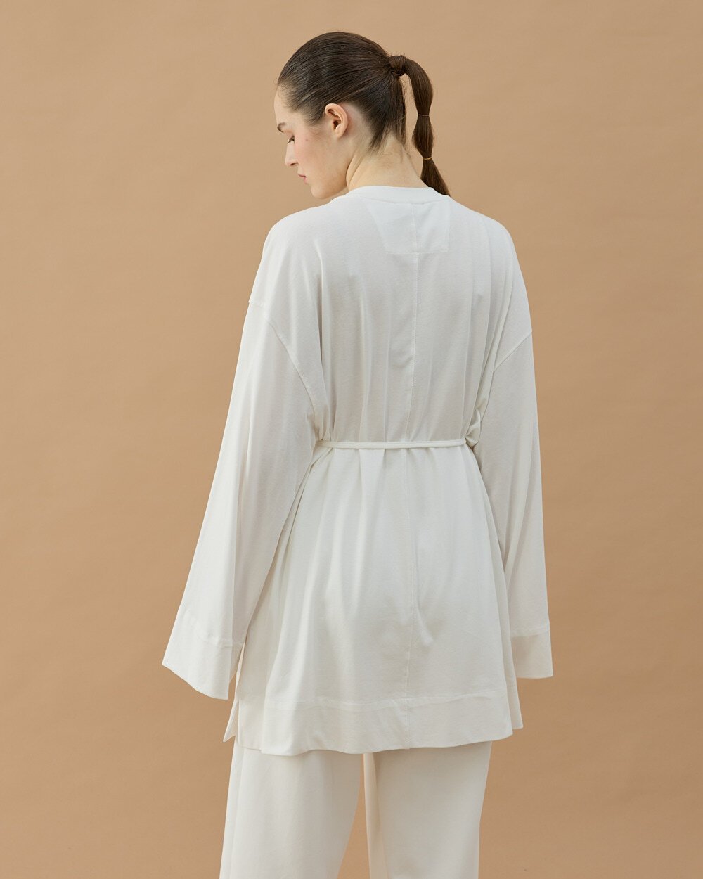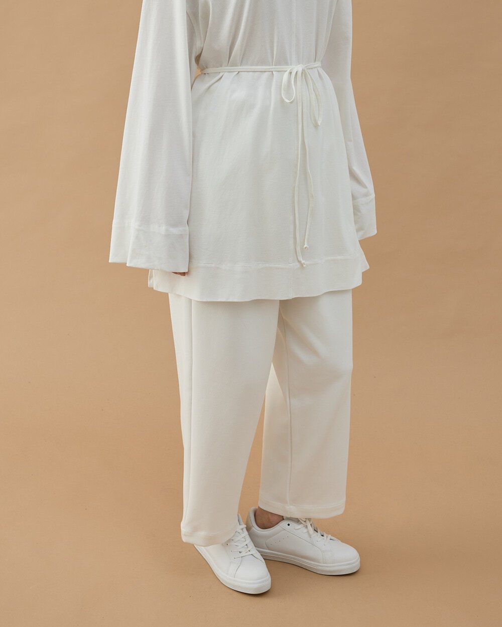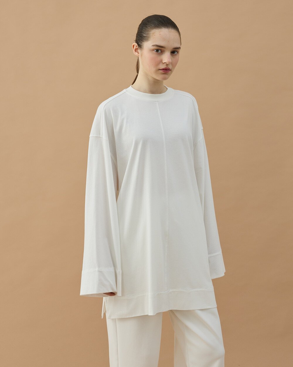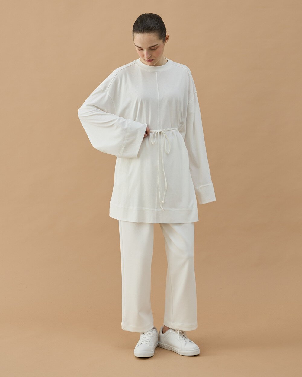 Minimal ve modern tasarımıyla öne çıkan bu tunik, rahat kalıbı ve akıcı kumaş yapısıyla gün boyu konfor sağlar. Bel kısmındaki ayarlanabilir bağlama detayı sayesinde vücuda göre şekil alarak zarif bir siluet oluşturur. Uzun tunik formu sayesinde pantolonlarla rahatça kombinlenebilir ve günlük stilinize şık bir dokunuş katar.