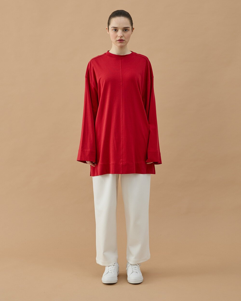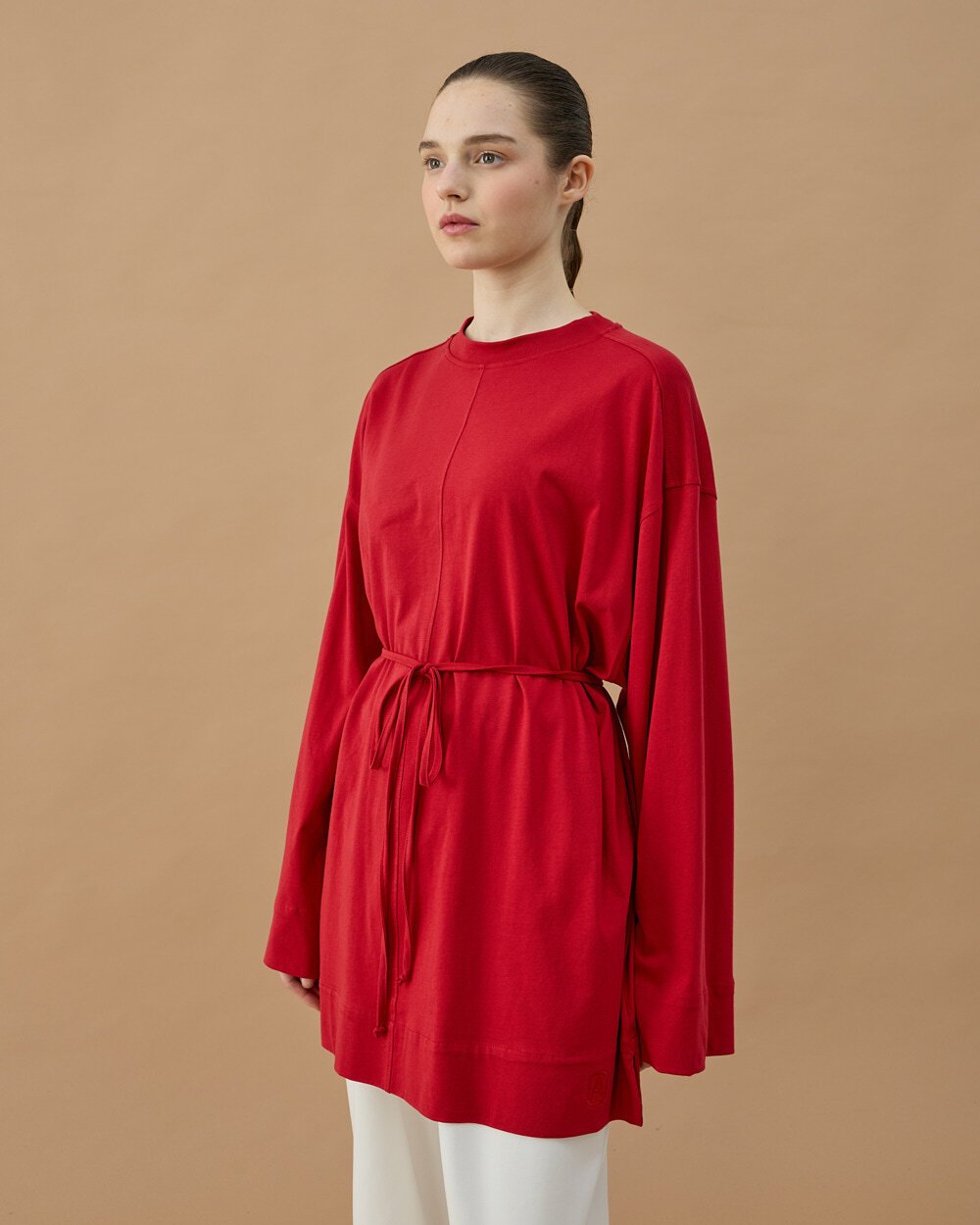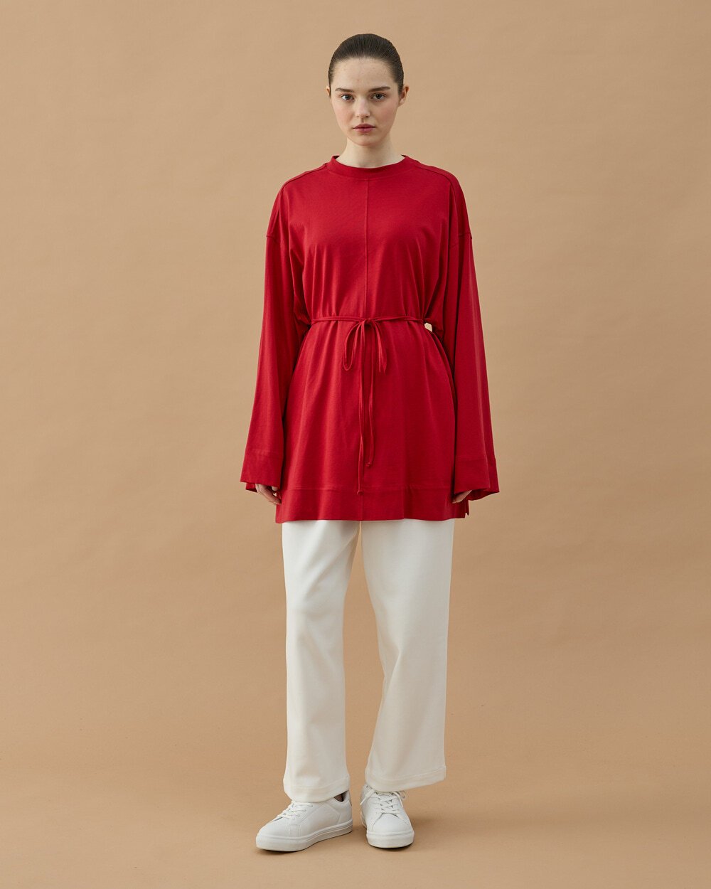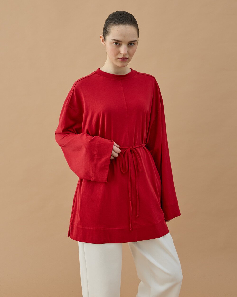 Minimal ve modern tasarımıyla öne çıkan bu tunik, rahat kalıbı ve akıcı kumaş yapısıyla gün boyu konfor sağlar. Bel kısmındaki ayarlanabilir bağlama detayı sayesinde vücuda göre şekil alarak zarif bir siluet oluşturur. Uzun tunik formu sayesinde pantolonlarla rahatça kombinlenebilir ve günlük stilinize şık bir dokunuş katar.