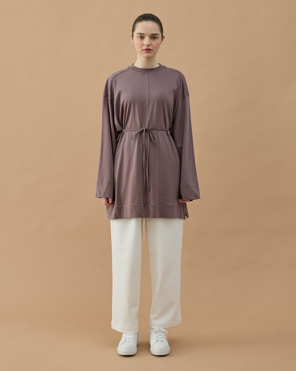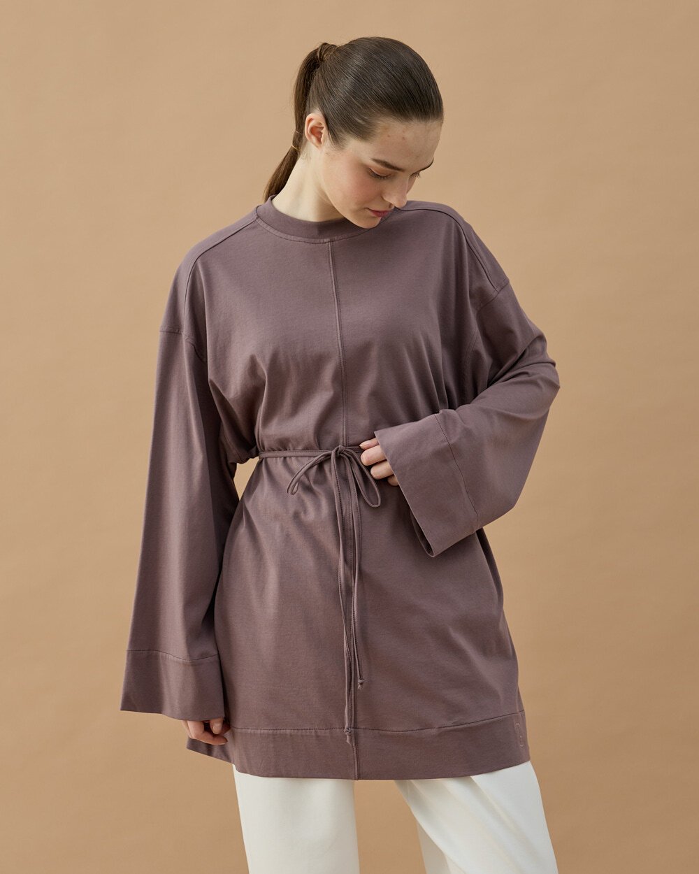 Minimal ve modern tasarımıyla öne çıkan bu tunik, rahat kalıbı ve akıcı kumaş yapısıyla gün boyu konfor sağlar. Bel kısmındaki ayarlanabilir bağlama detayı sayesinde vücuda göre şekil alarak zarif bir siluet oluşturur. Uzun tunik formu sayesinde pantolonlarla rahatça kombinlenebilir ve günlük stilinize şık bir dokunuş katar.