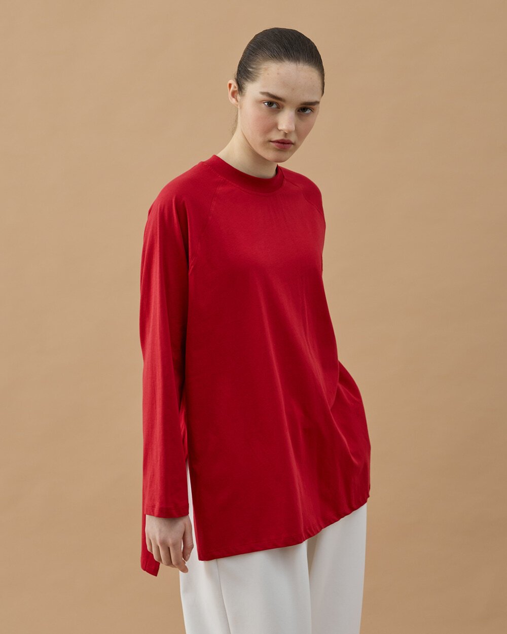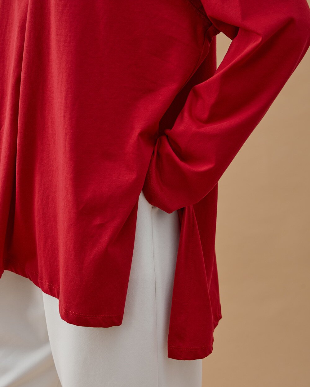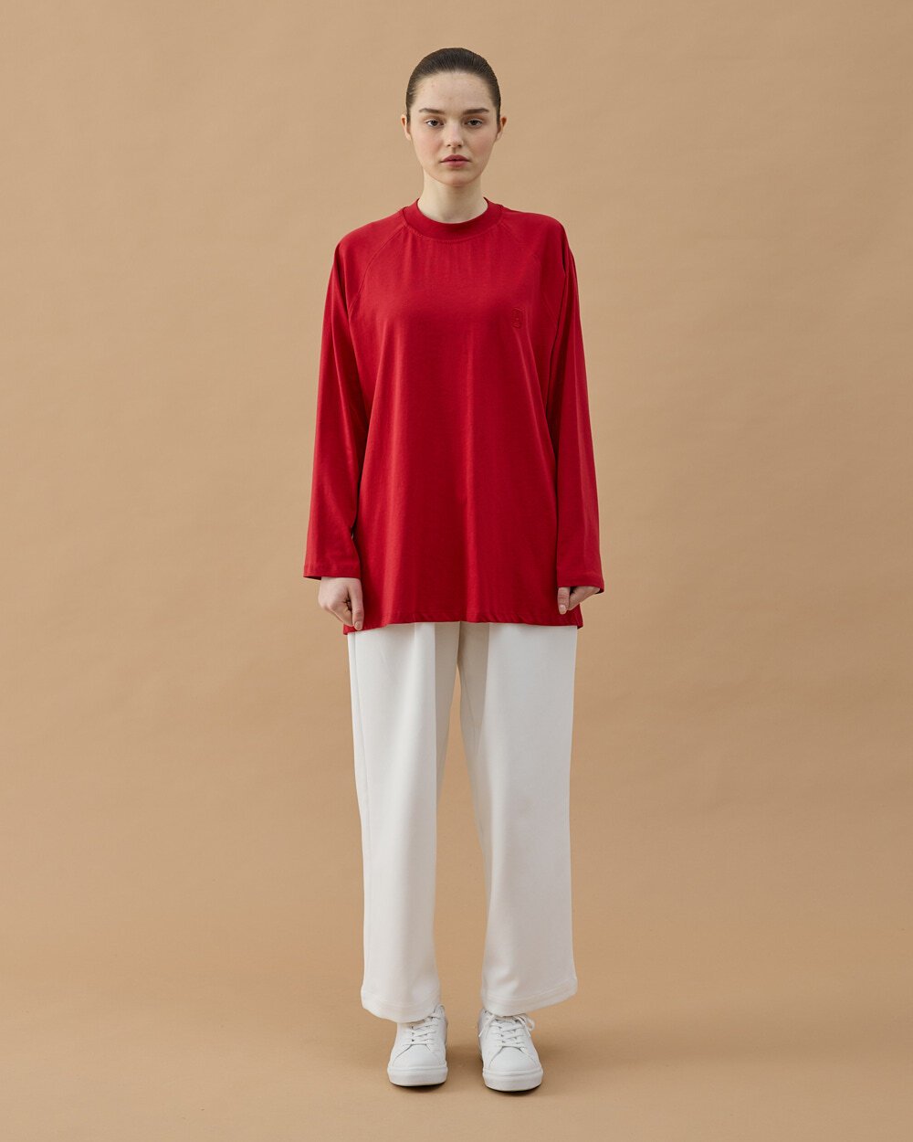 Reglan kol kesimi ile omuz hattında daha yumuşak ve sportif bir görünüm sağlarken, geniş kalıbı hareket özgürlüğünü artırır. Yan yırtmaç detayı ürüne dinamik bir duruş kazandırırken, uzayan arka boyu farklı alt parçalarla rahatlıkla kombinlenmesine olanak tanır. Minimal nakış detayı ise sade şıklığı tamamlar.