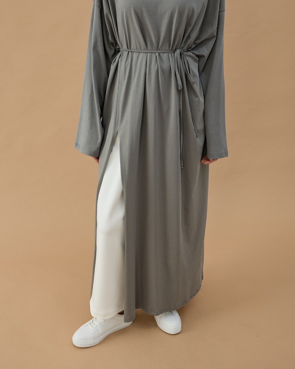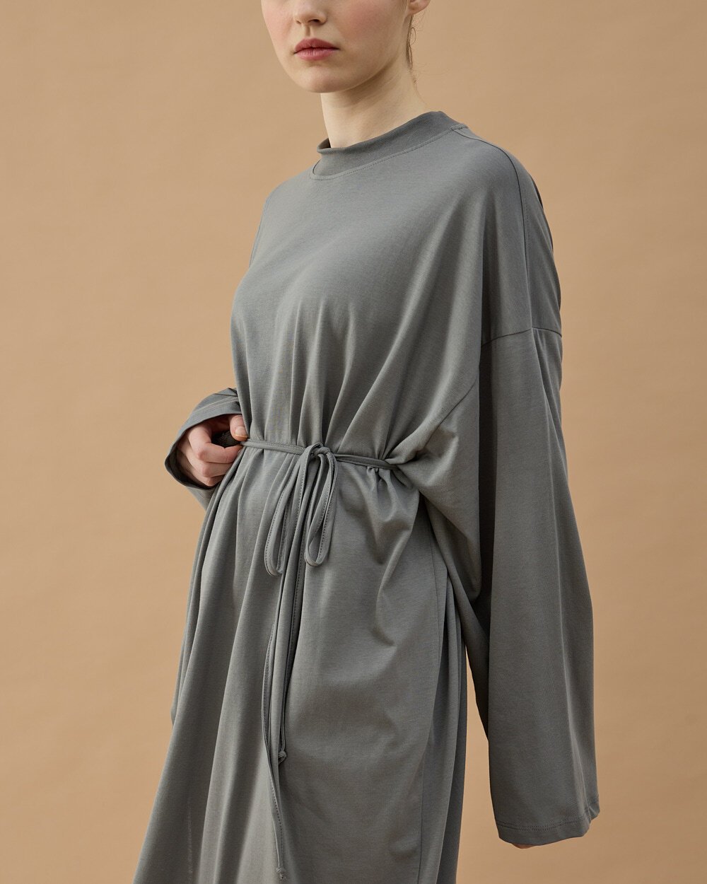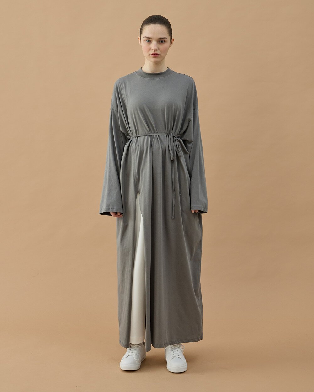 Rahat kalıbı ve modern tasarımıyla öne çıkan bu uzun elbise, akıcı kumaş yapısı sayesinde gün boyu konfor sunar. Bel kısmındaki ayarlanabilir bağlama detayı sayesinde vücuda göre şekil alarak zarif bir görünüm oluşturur. Uzun ve dökümlü formu ile hem günlük kullanımda hem de şık kombinlerde rahatlıkla tercih edilebilir.