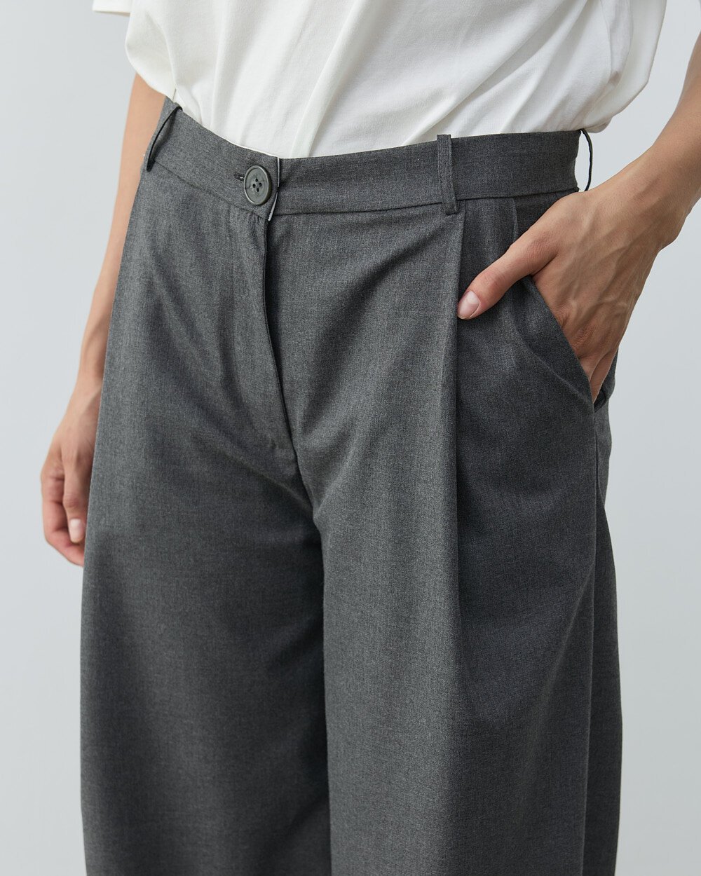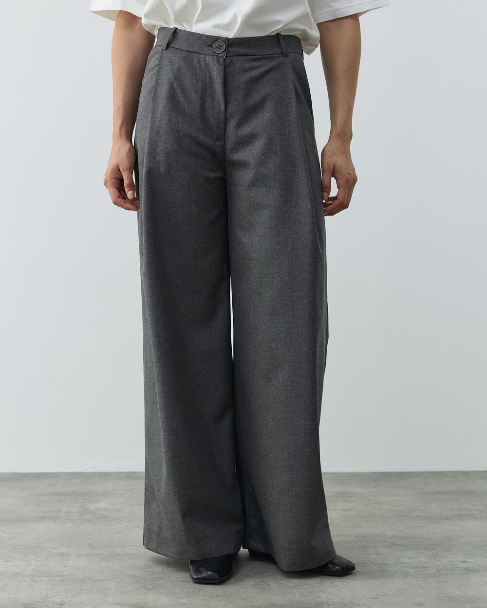 Detay: Ön bölümde yer alan tek pile detayı ile hacimli ve dengeli bir siluet sunar. Wide leg formu sayesinde belden aşağı rahat bir düşüş sağlar. Yüksek bel yapısı vücut oranını dengelerken, klasik kapama detayı ve yan cepler fonksiyonel kullanım sunar. Günlük ve ofis kombinlerine uyum sağlayacak şekilde tasarlanmıştır. Rahat kalıp yapısı hareket özgürlüğünü destekler.